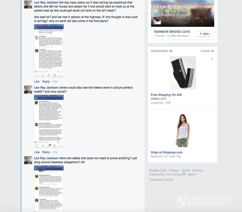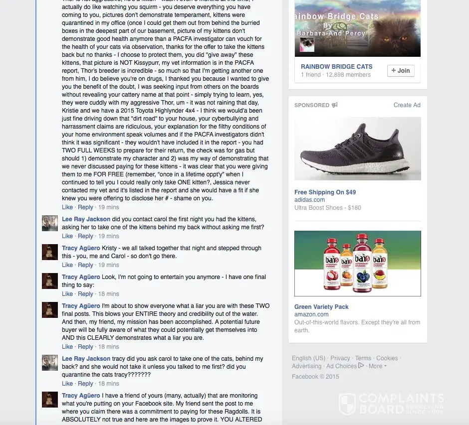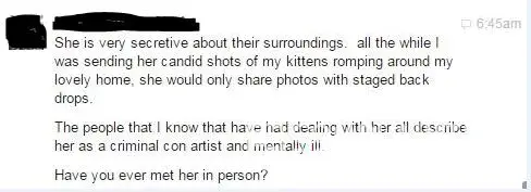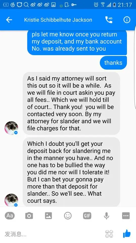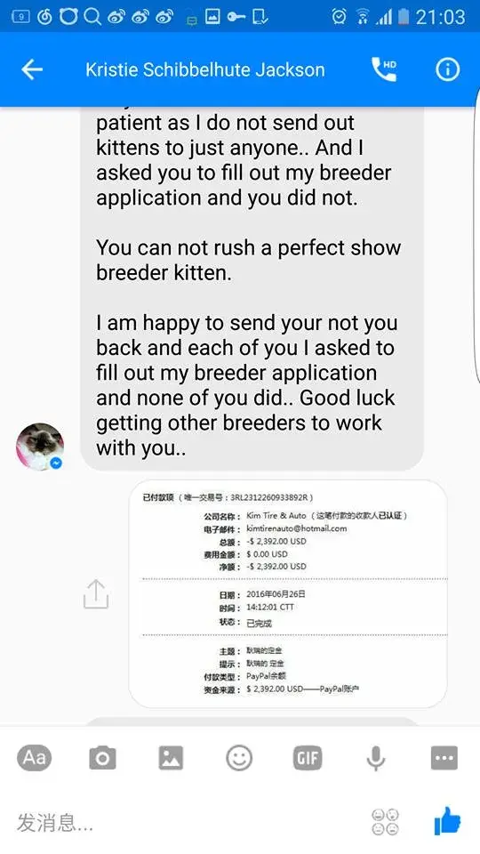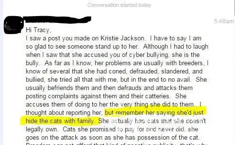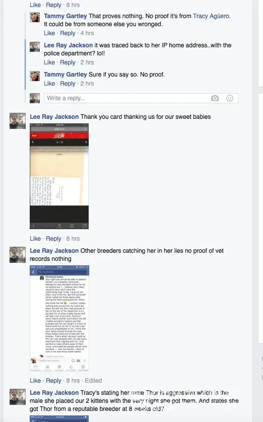 And finally, Kristie - this is directed towards you. By mentioning my employer, who has nothing to do with the exchange of these kittens, you have finally crossed a line that will not be tolerated. I have an attorney who has been sitting on the fence that will gladly take it from here and engage representing both me and my employer. And as long as I'm willing to pay for their travel, I have plenty of people that are willing to join me in a courtroom to share their experiences with you.