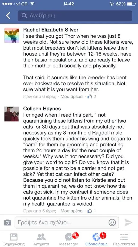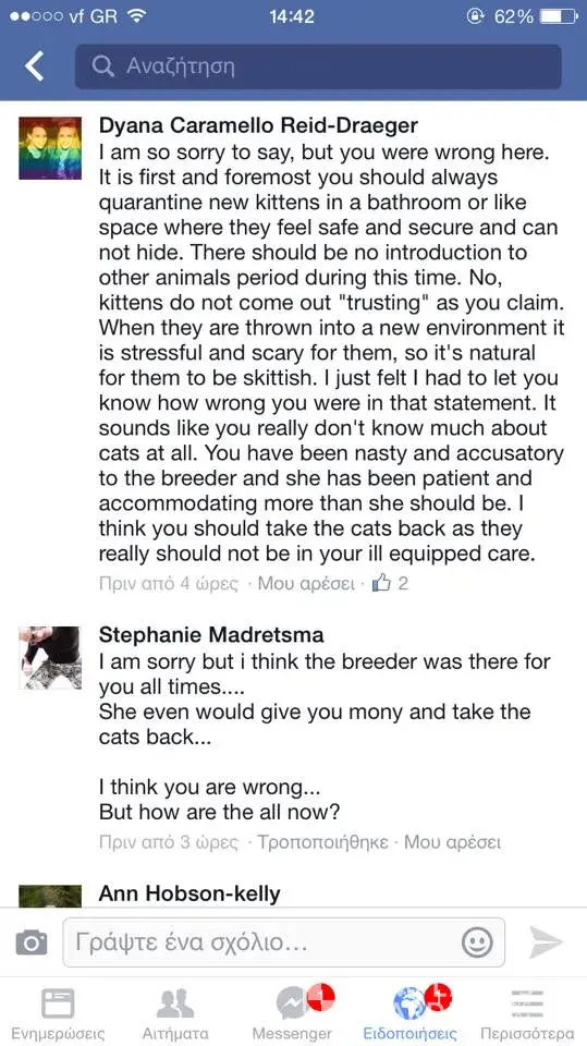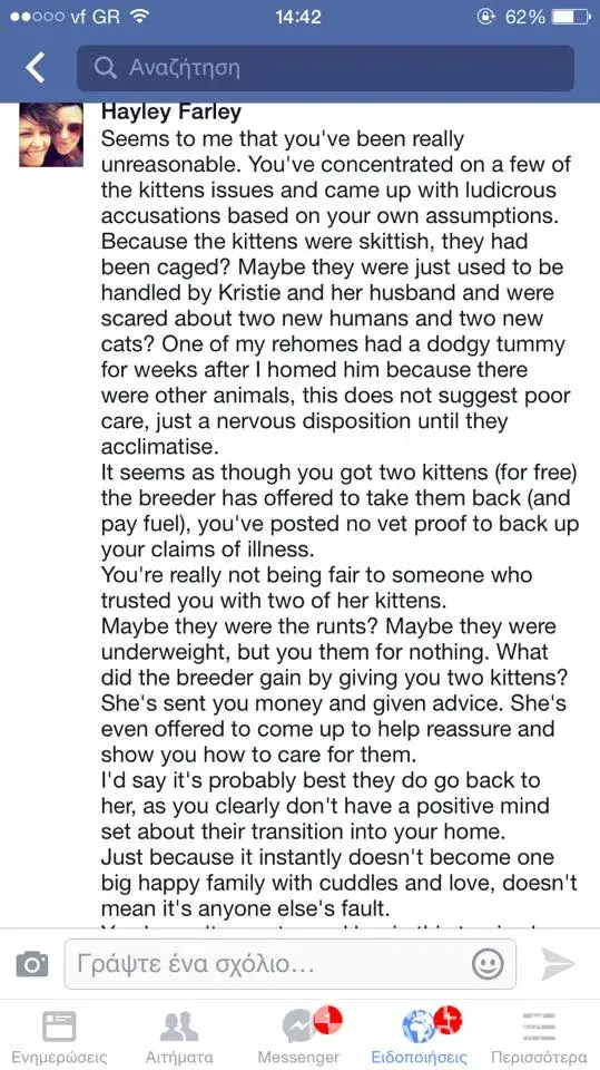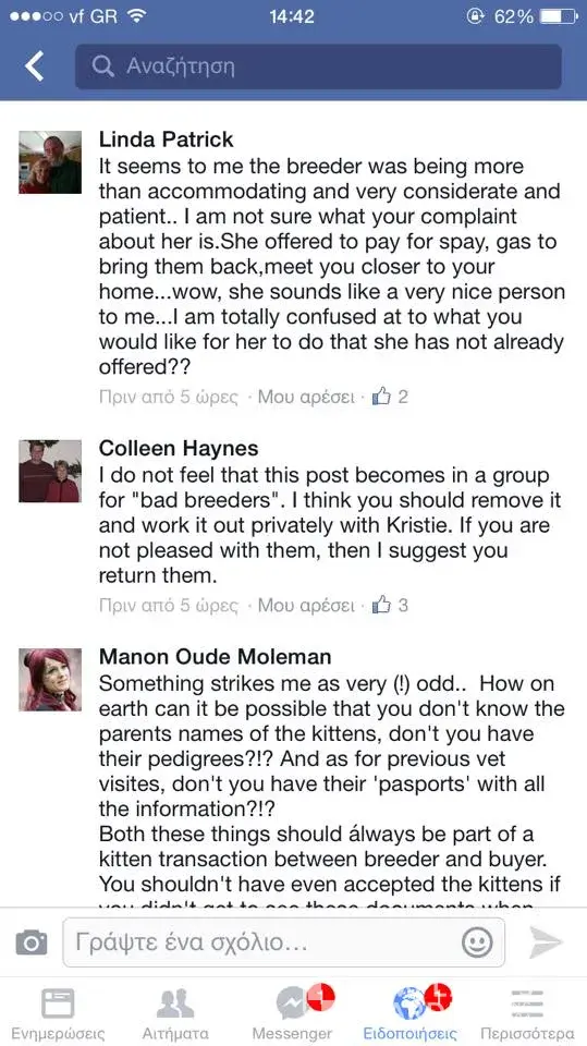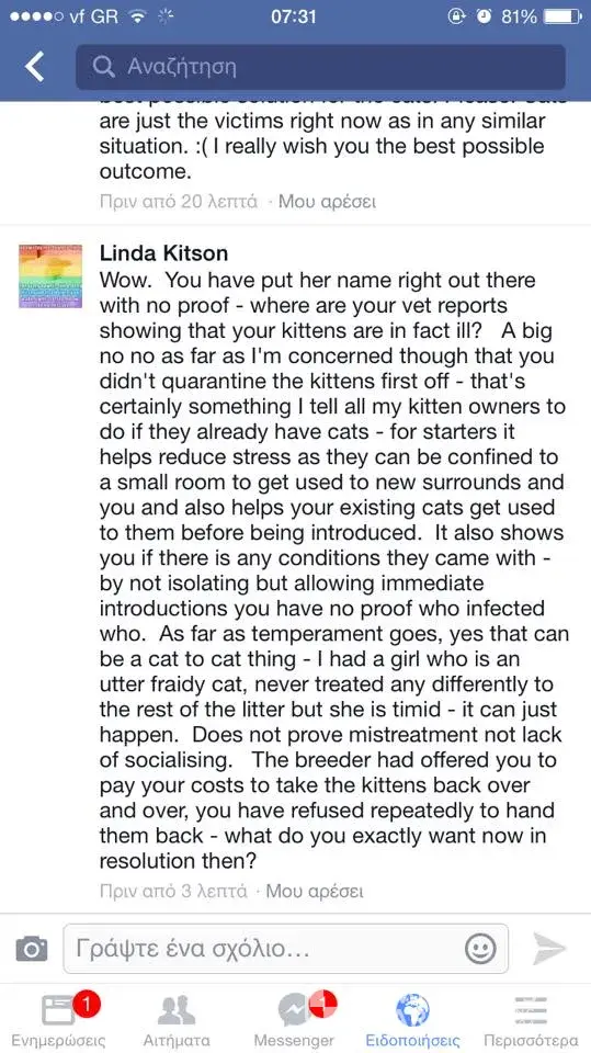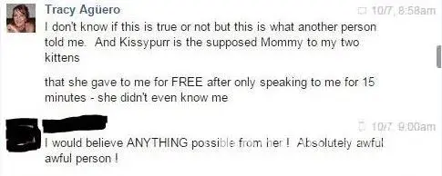 You got free kittens and you are on a quest to destroy this breeders reputation? What part of they are free? ETC is wrong with you? You are freaking psycho. That poor breeder. You need a long stay in a psych ward.