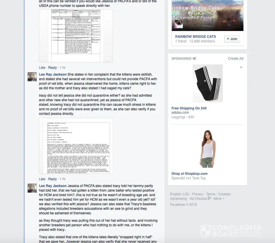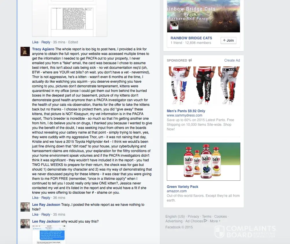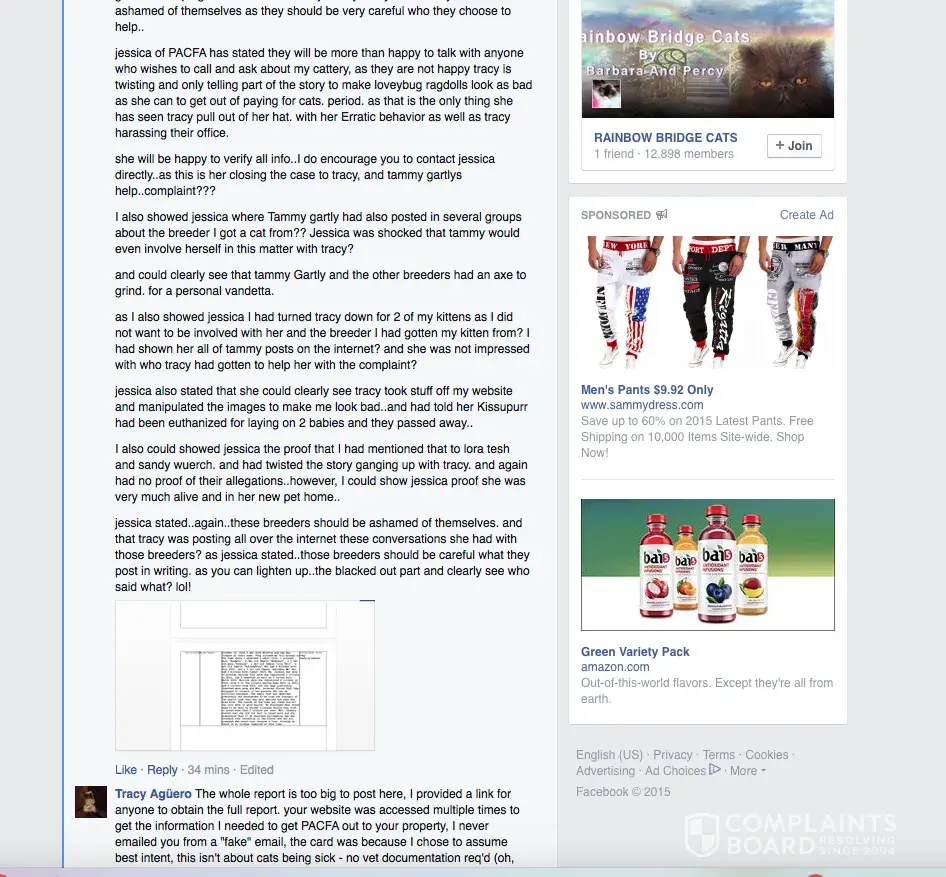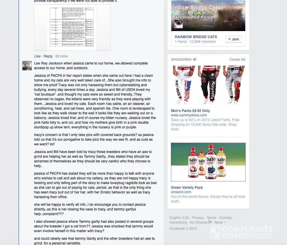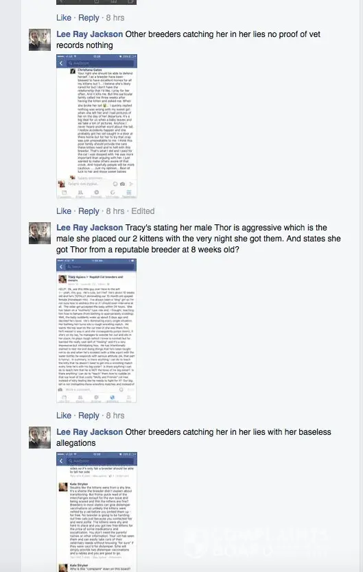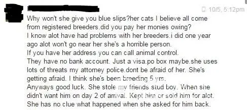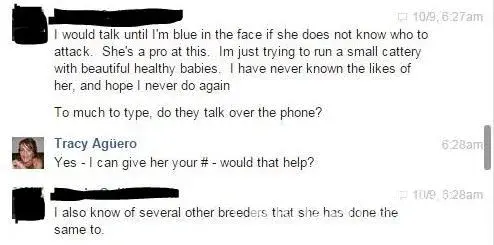 HOWEVER, It is certainly clear based I have had to defend myself Against tracy's baseless and misinformed allegations as I also have A PLETHORA of proof for court of Tracy's EXTREME irrational unstable behavior. Tracy states "An ethical breeder that didn't have anything to defend would not work as hard as she is to try to deflect the attention from her and put it on others". it's called defending my right as a human being when someone is trying to assassinate someones character especially when it's baseless allegations. Even Licensed local and government officials could see tracy was lying to get out of paying for cats!
