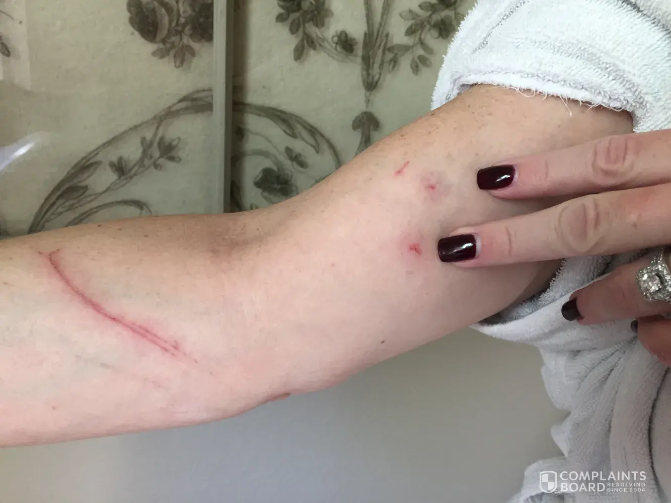 Loveybug Ragdolls - update - 4 months later - I literally had to peel her claws out of these holes in my arm. This is not characteristic of the Ragdoll breed - at all. THIS is what happens when kittens are abused and neglected the first 4 months of their lives. I've had them for 4 months and still ... this. So, don't be fooled by the cute little pics that Kristie likes to post. You can't ### character and temperament via a photo of a cute little kitten. All kittens are cute! These photos, however, speak volumes.
