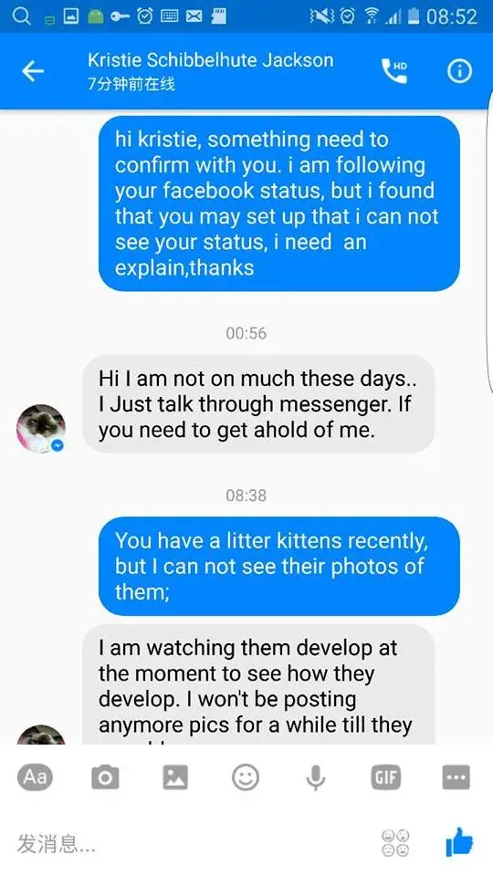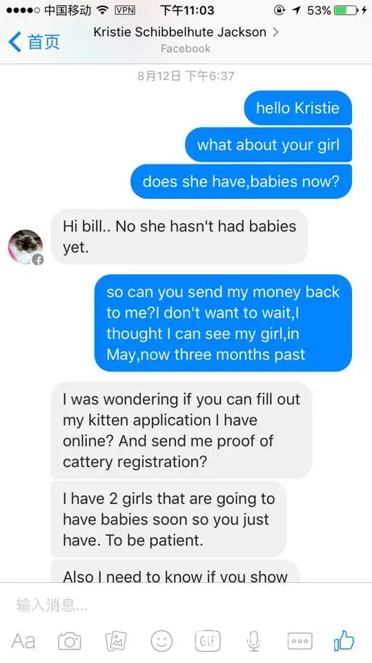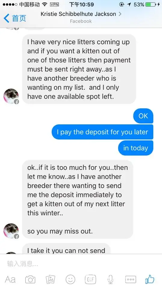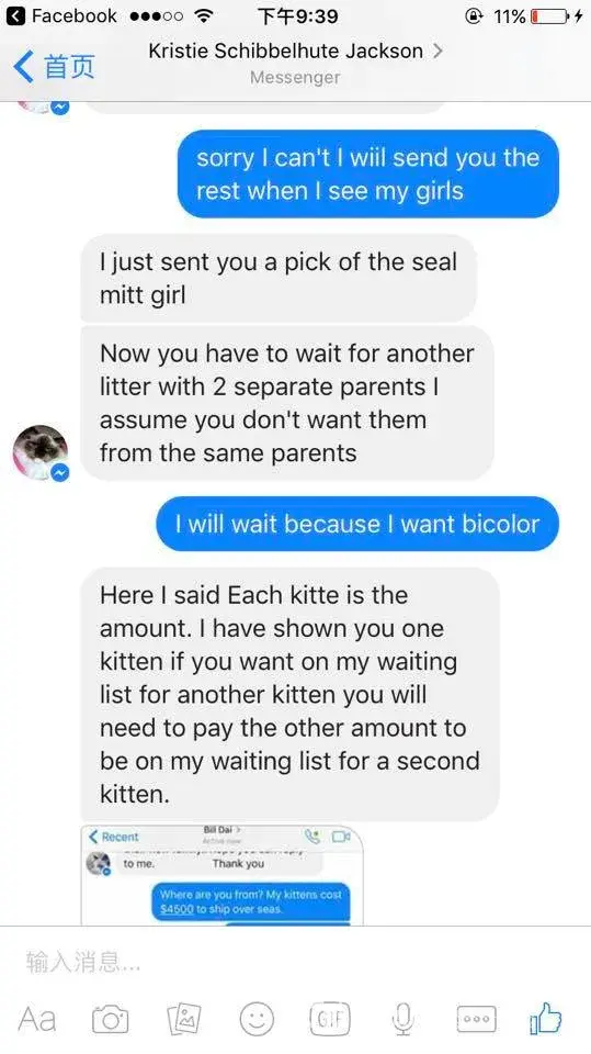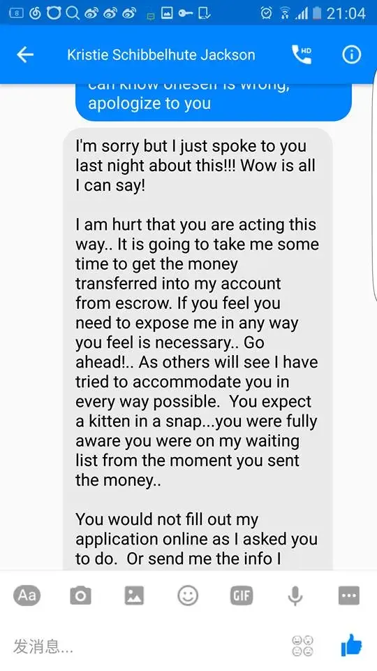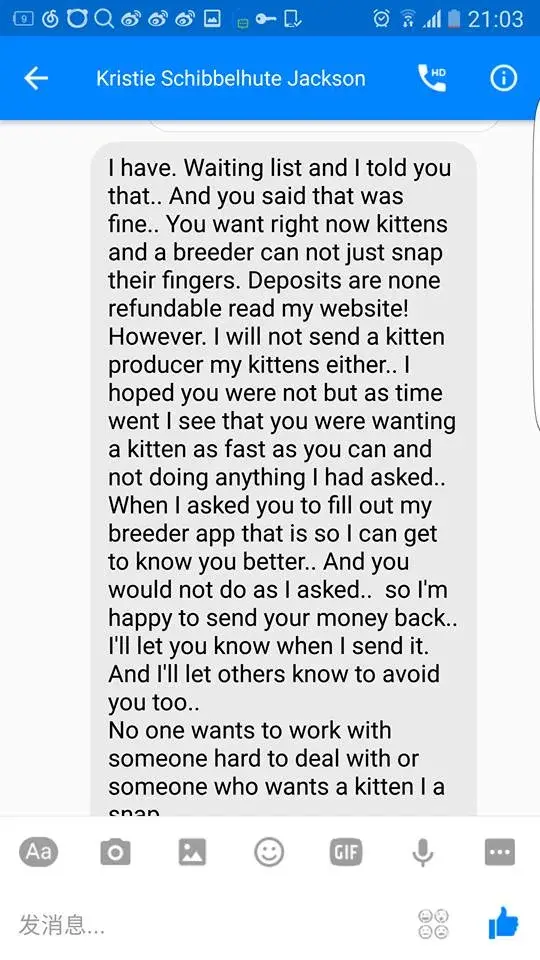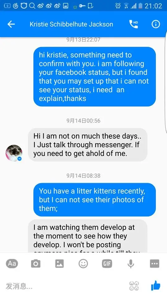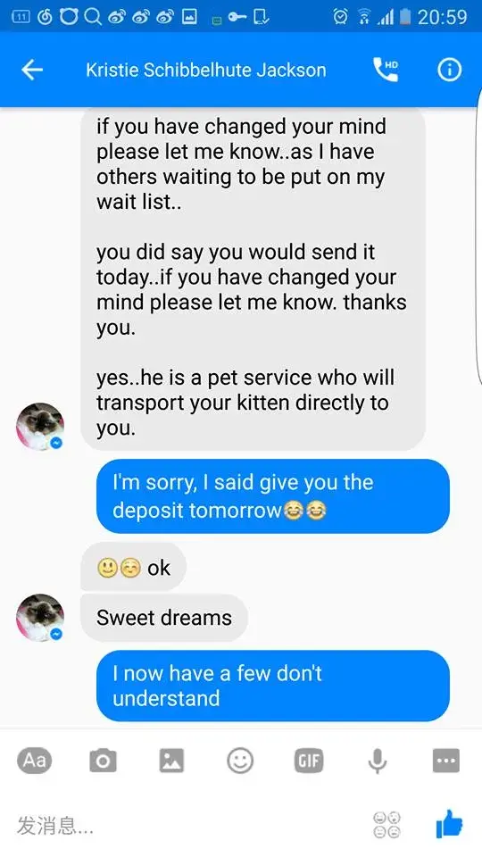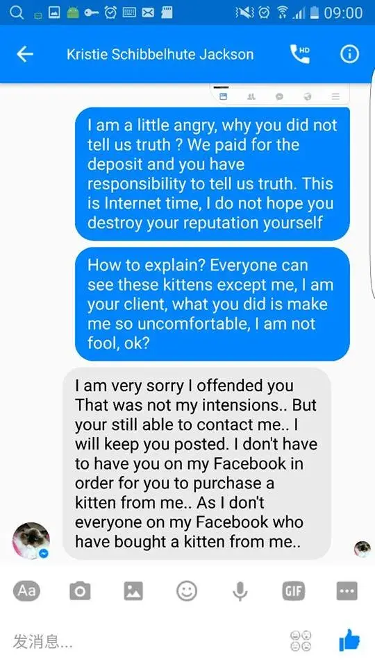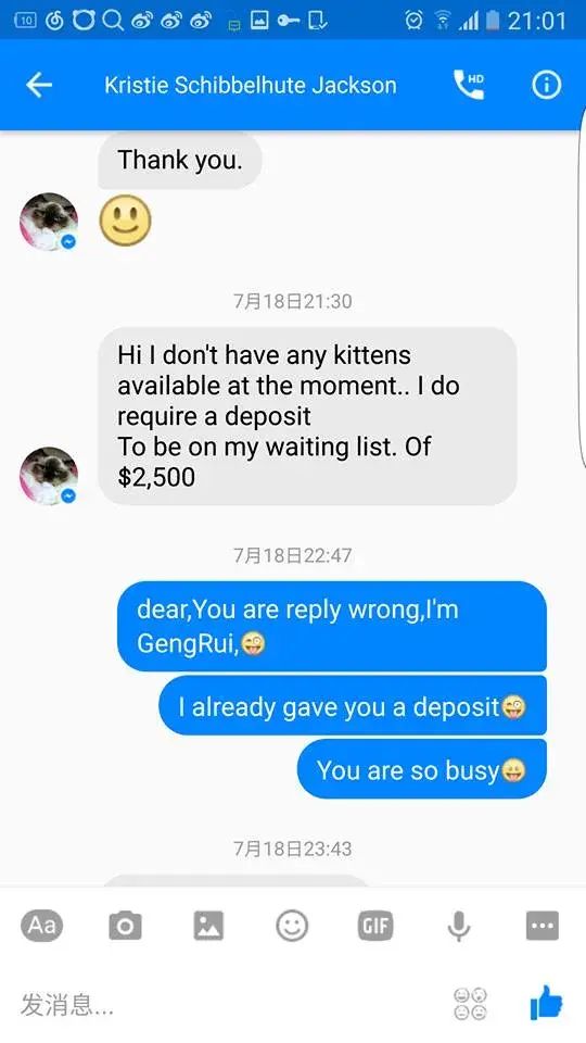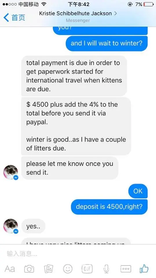 I later received a message from a friend who told me, Kristie had posted new pictures of kittens on her Facebook page but I could not see them (and Kristie and I were Facebook friends at the time). She was blocking me from the posts so that I could not see new kittens being born. When I sent her the picture asking her about it, she didn't explain why she kept this a secret from me and asked me to keep waiting. She finally she blocked me altogether from her Facebook.