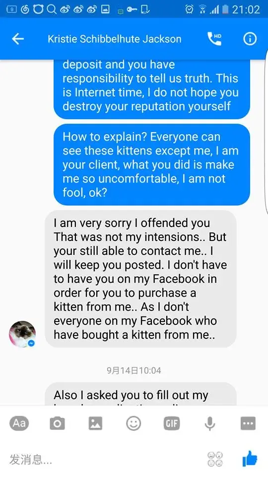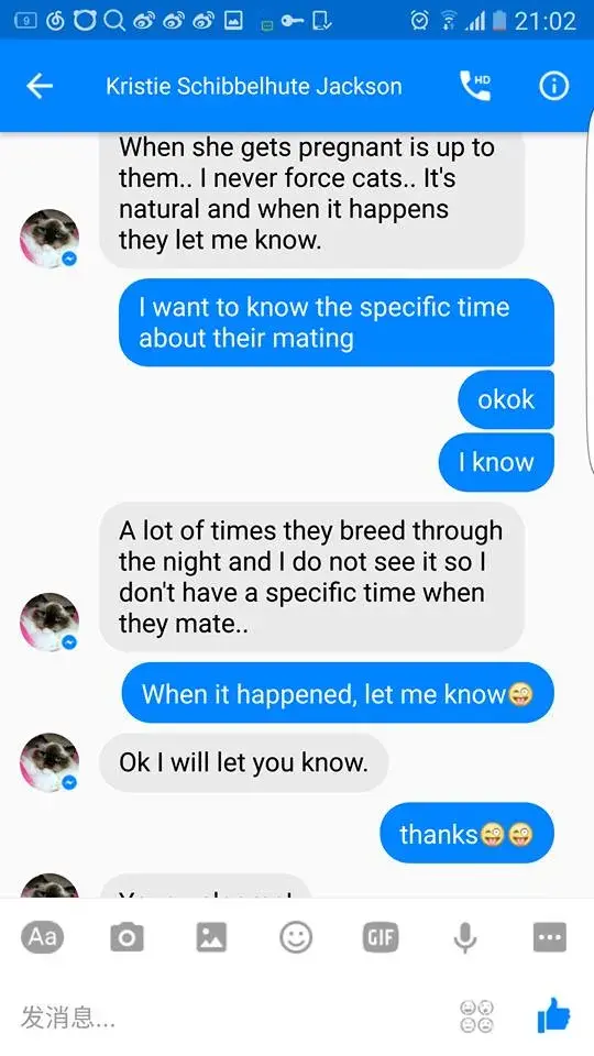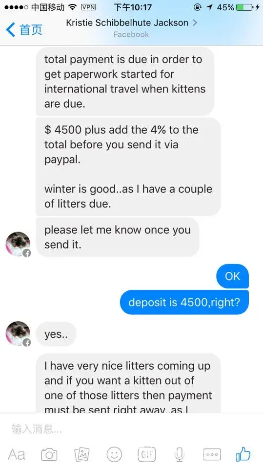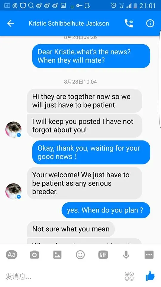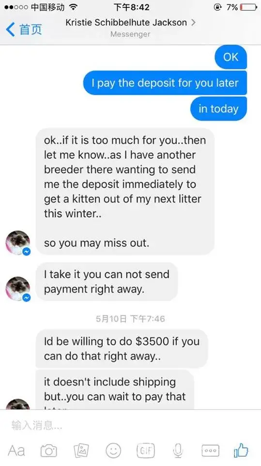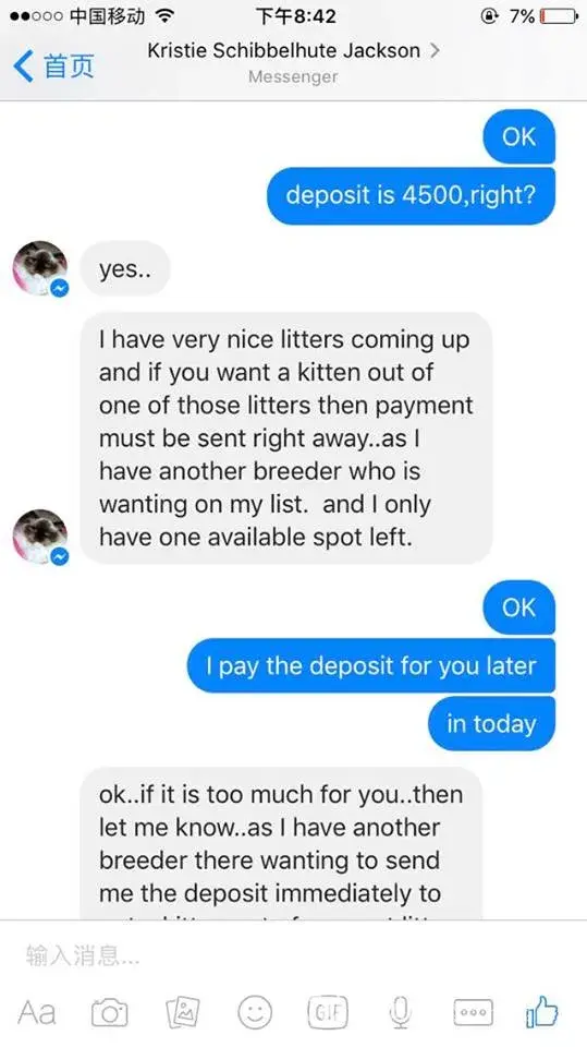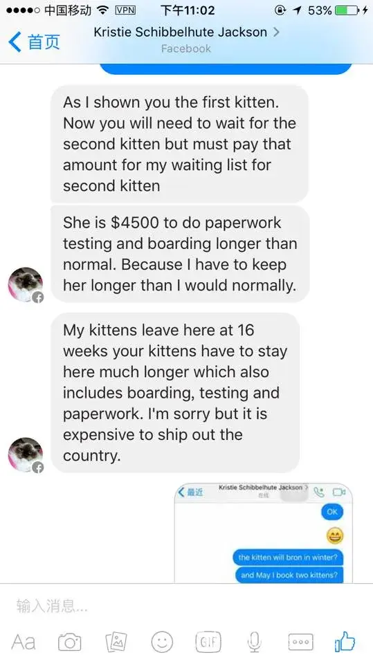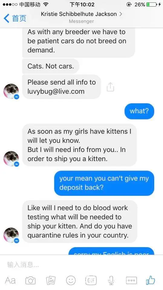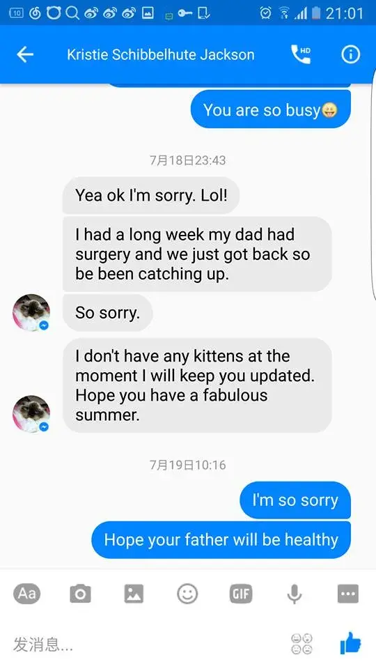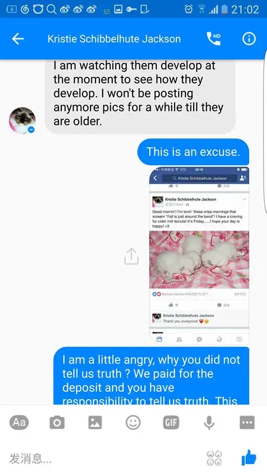 I later received a message from a friend who told me, Kristie had posted new pictures of kittens on her Facebook page but I could not see them (and Kristie and I were Facebook friends at the time). She was blocking me from the posts so that I could not see new kittens being born. When I sent her the picture asking her about it, she didn't explain why she kept this a secret from me and asked me to keep waiting. She finally she blocked me altogether from her Facebook.