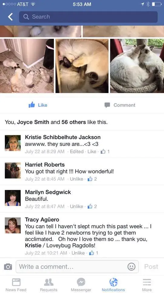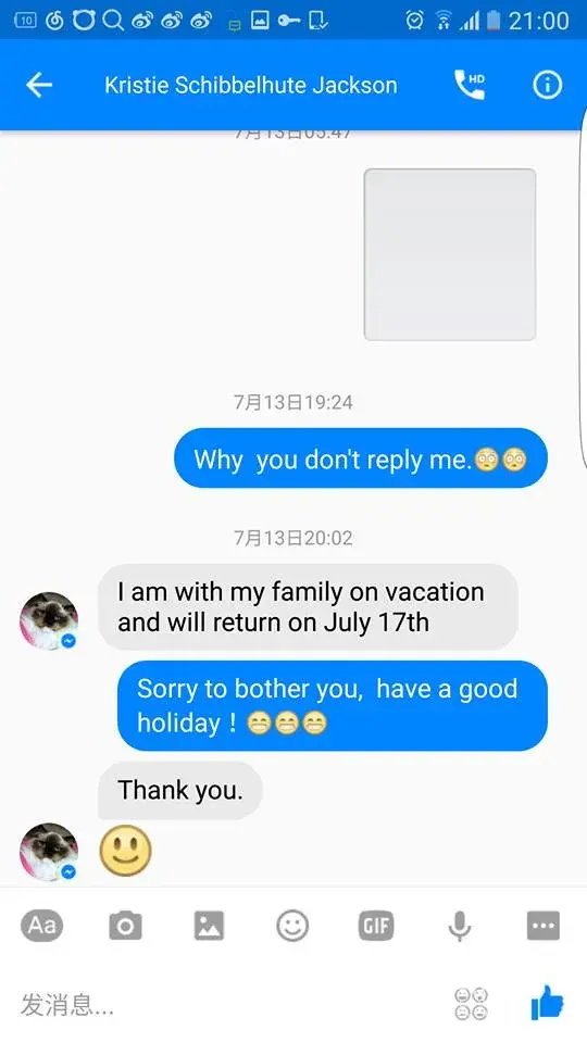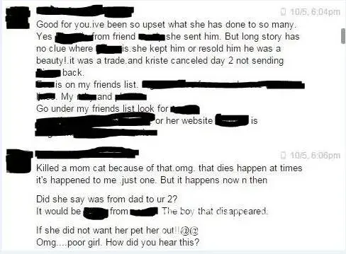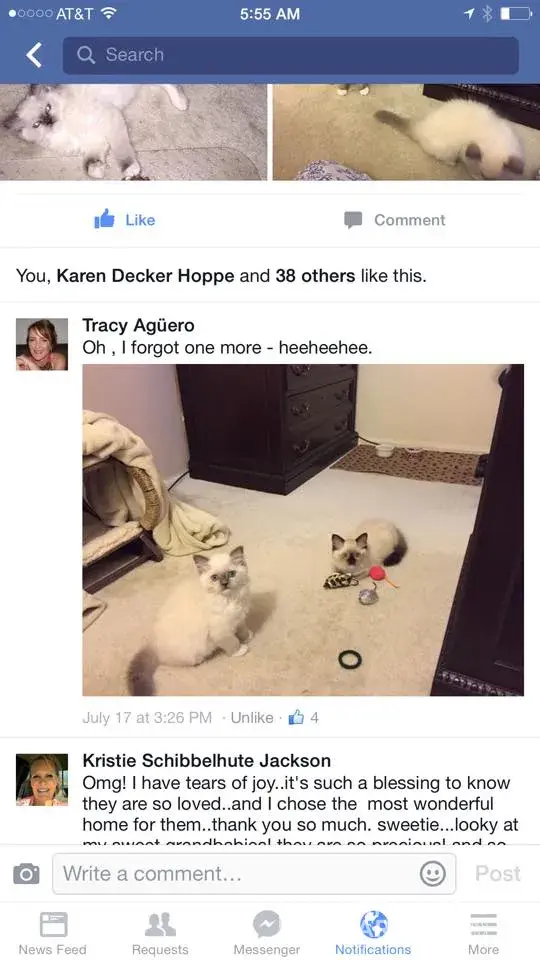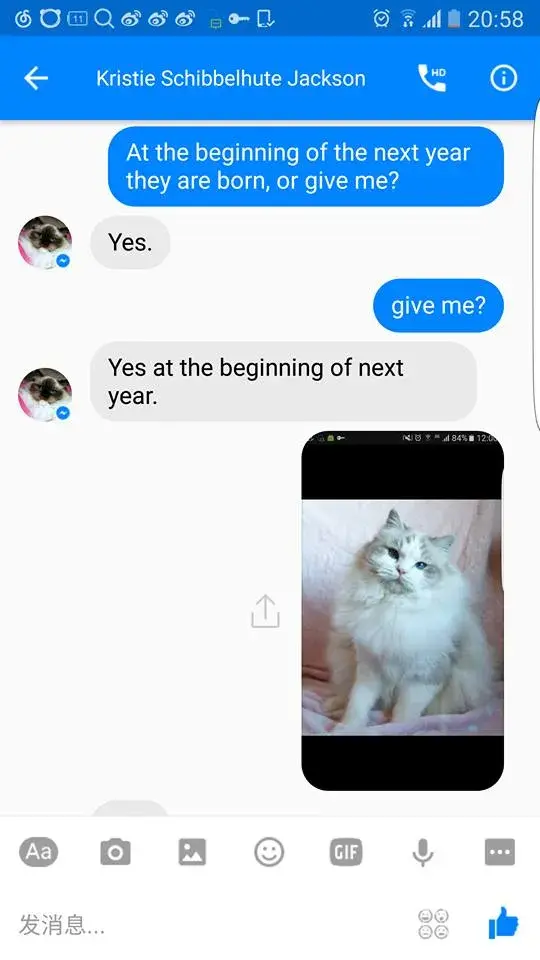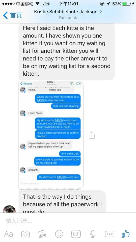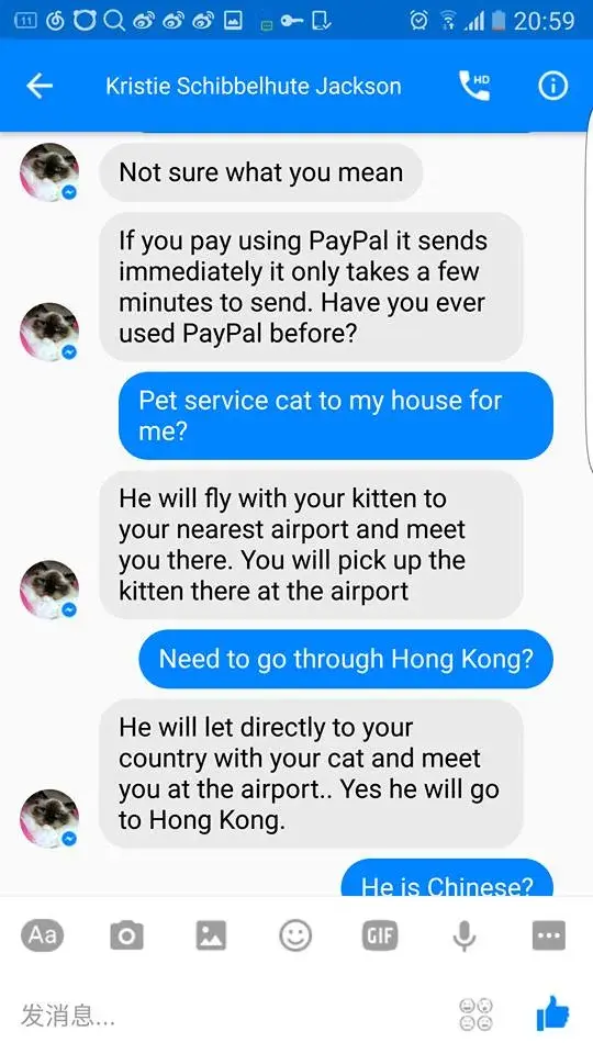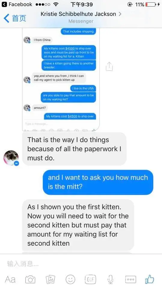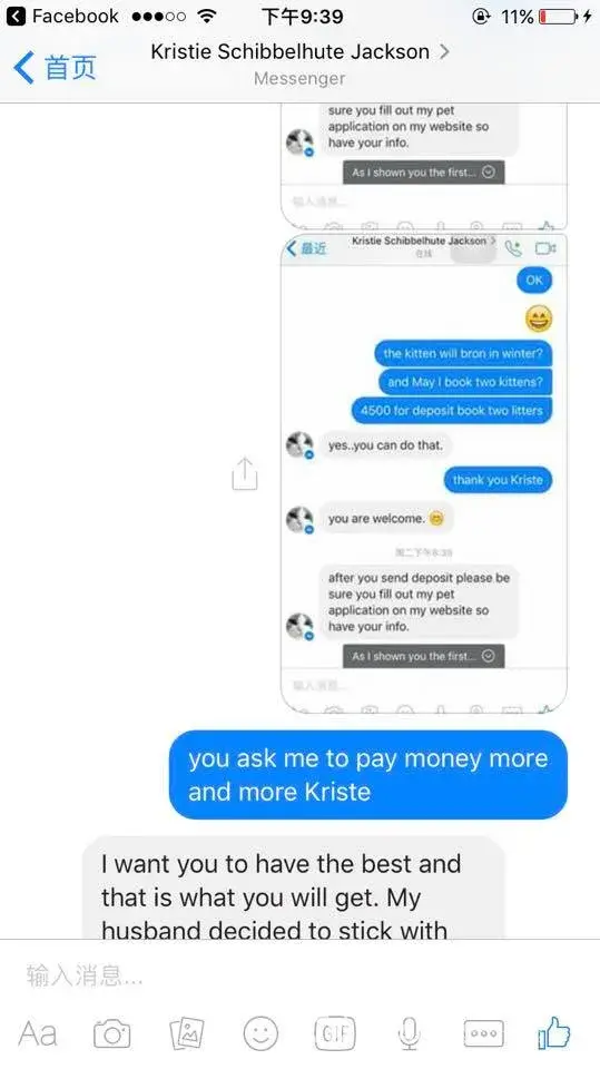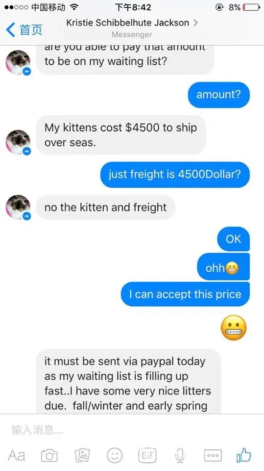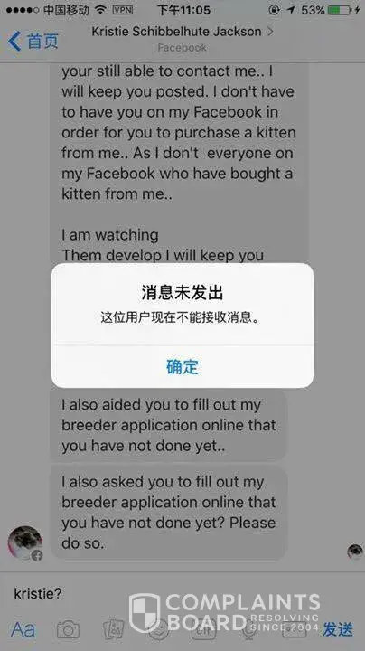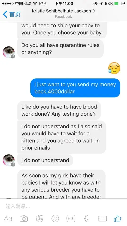 I later received a message from a friend who told me, Kristie had posted new pictures of kittens on her Facebook page but I could not see them (and Kristie and I were Facebook friends at the time). She was blocking me from the posts so that I could not see new kittens being born. When I sent her the picture asking her about it, she didn't explain why she kept this a secret from me and asked me to keep waiting. She finally she blocked me altogether from her Facebook.