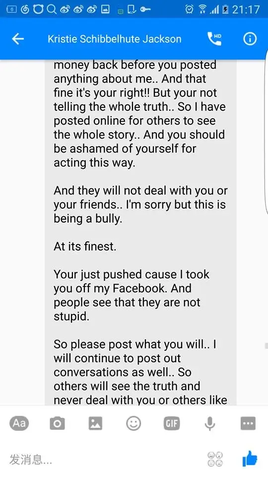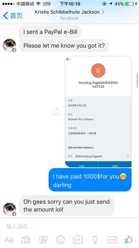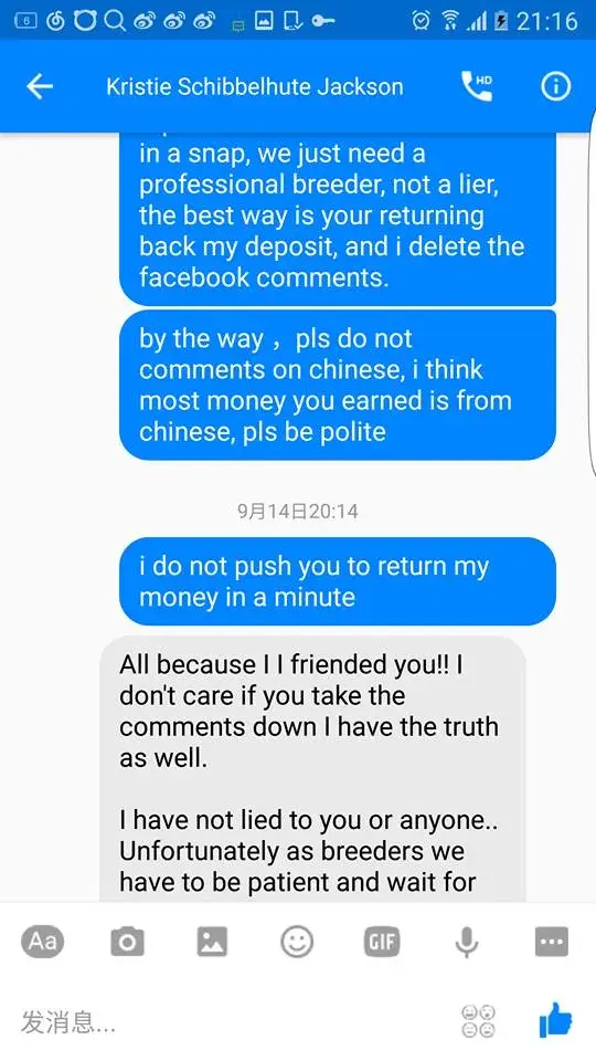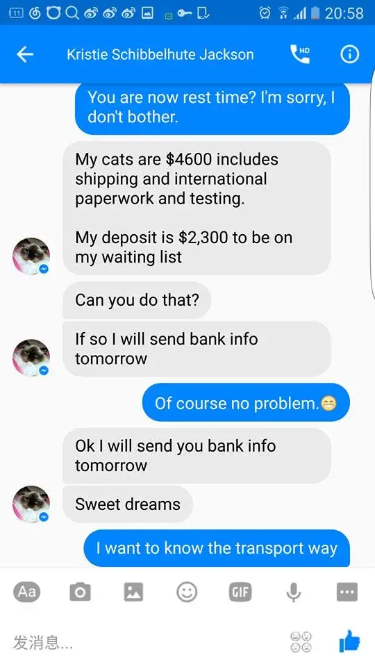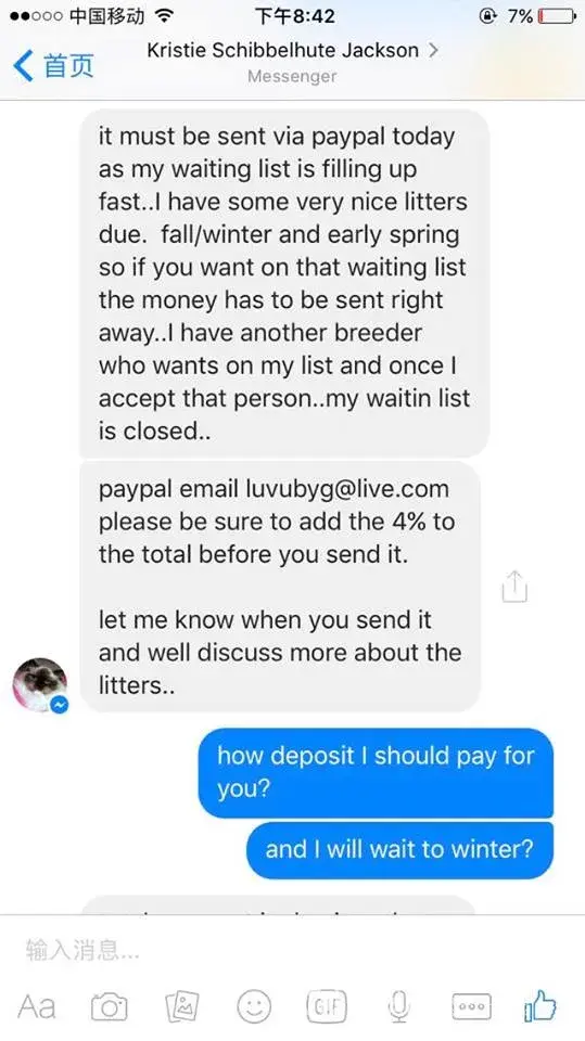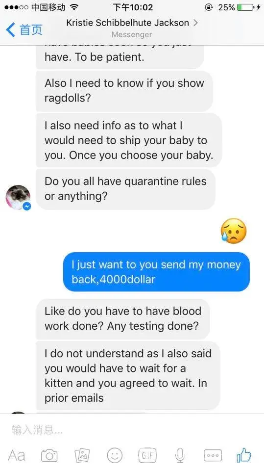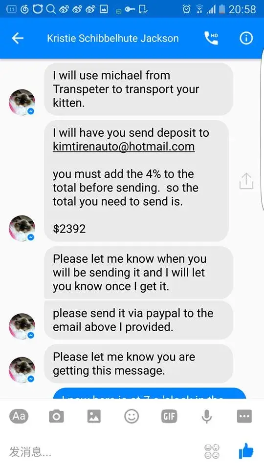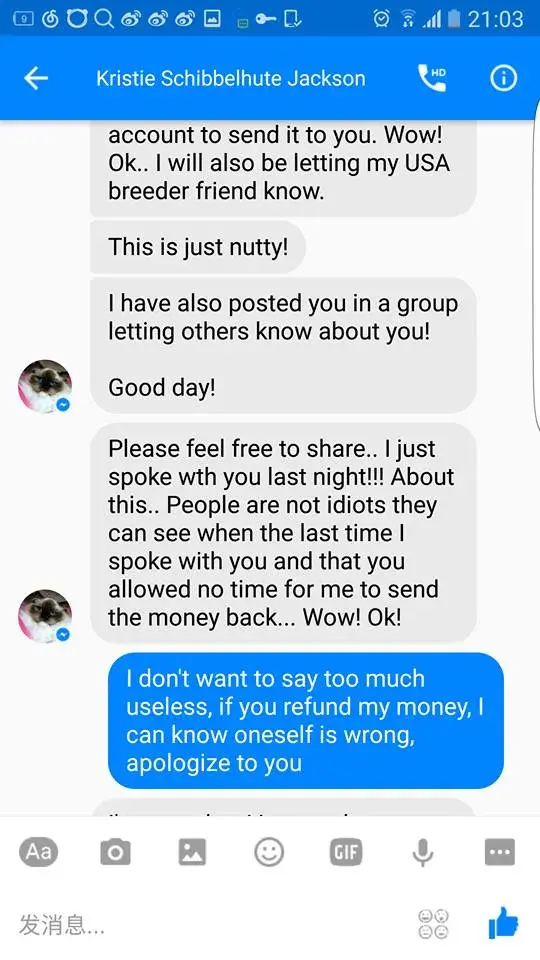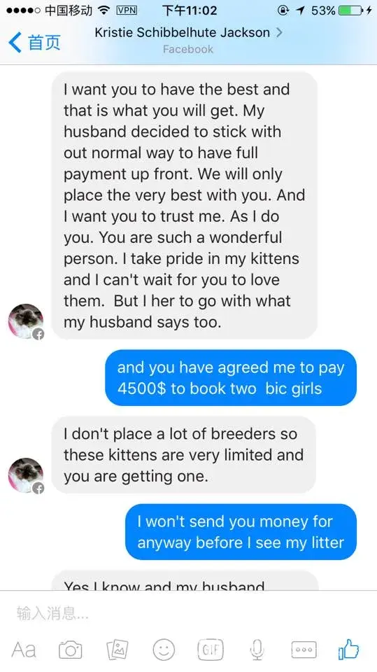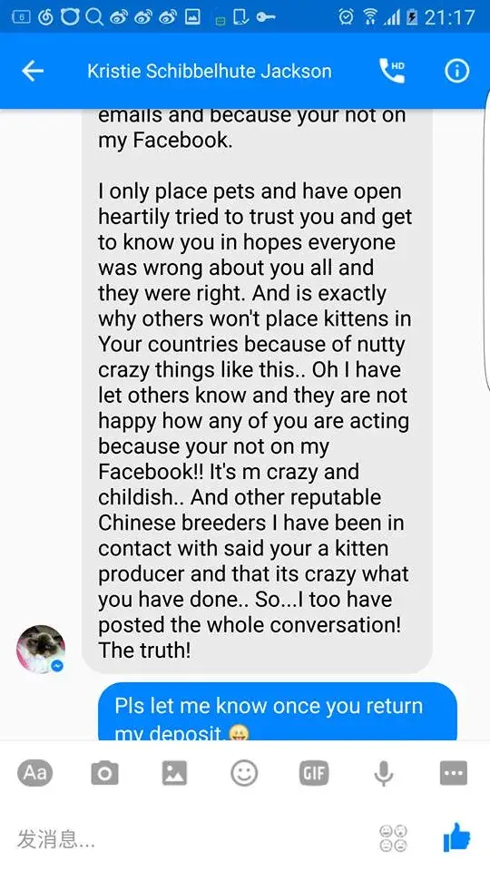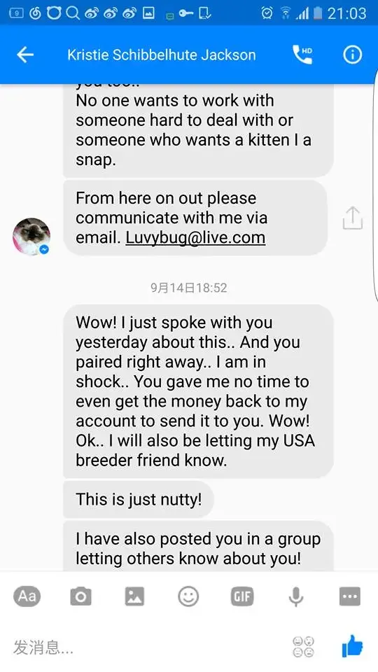 I am a Ragdoll breeder and have owned a little new cattery for a year. Unfortunately, I have been forced into a terrible situation which I would like to share with other breeders. Please stay away from Kristie Schibbelhute Jackson of Loveybug Ragdolls. In May of this year, I saw photos of Kristie's ragdolls on her Facebook page. After chatting with Kristie for a while, she told me that her girl was pregnant and would give birth soon. She asked me to pay her $[protected] is full payment for one baby) plus $1000 for the cost of vaccines and I could choose two girls from this litter. So, I paid her $5500 in May via PayPal with the promise that the babies would come to me at the end of this year.
