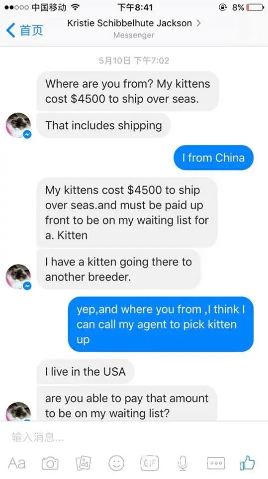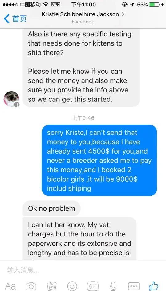 as $2000 for shipping to china and testing, I was paying for testing out of my own pocket..and $2000 for the kitten .Typical show/breeders are $2300 to $2600..they have not explained that in this. each kitten would have been shipped separately. and would cost $2000 to ship and test each kitten..