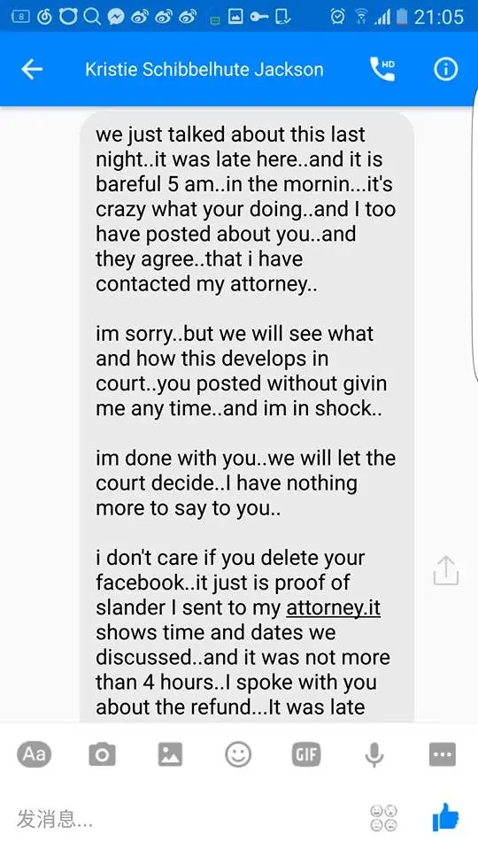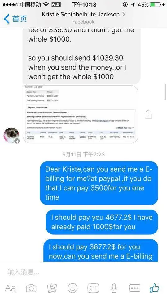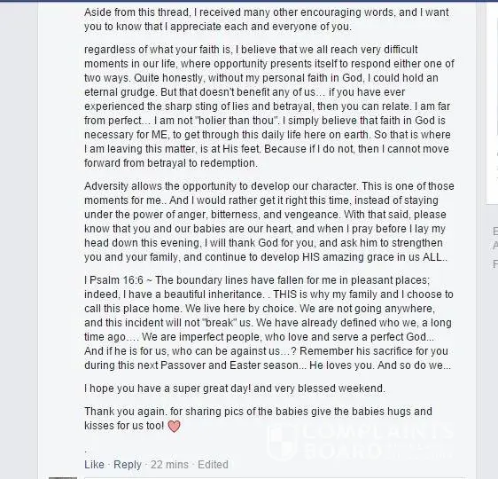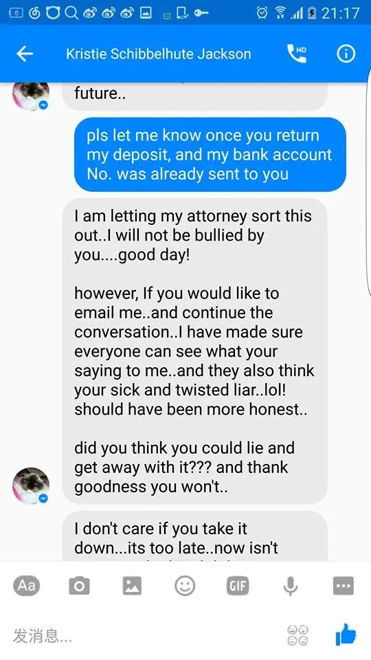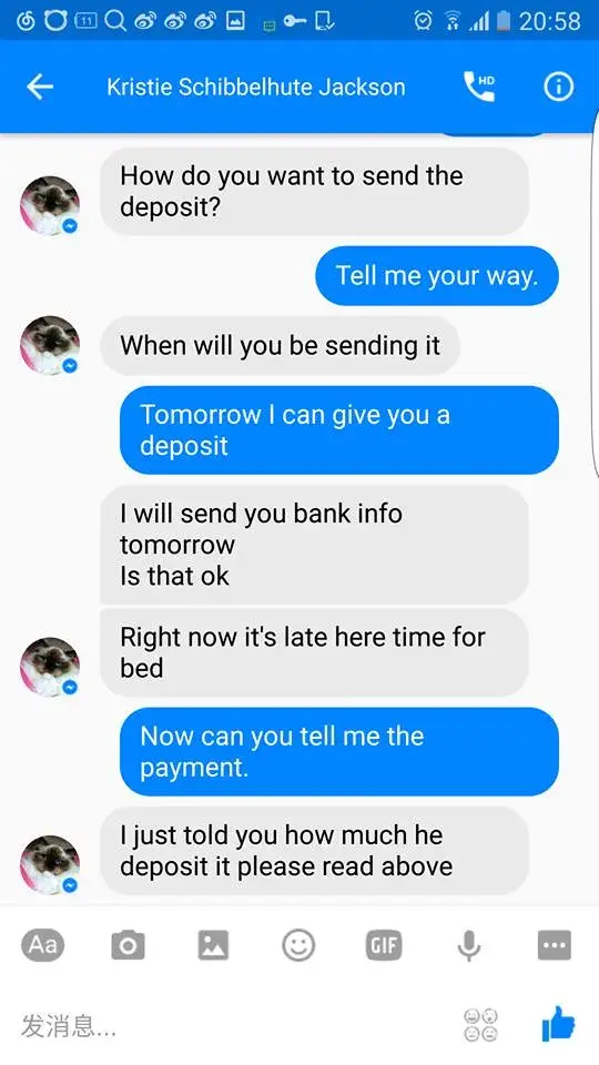After a week, Kristie wrote to me and said if I want the two babies, I need to pay an additional $4500, full payment of the second baby but I refused. I have never given full payment for a deposit.
