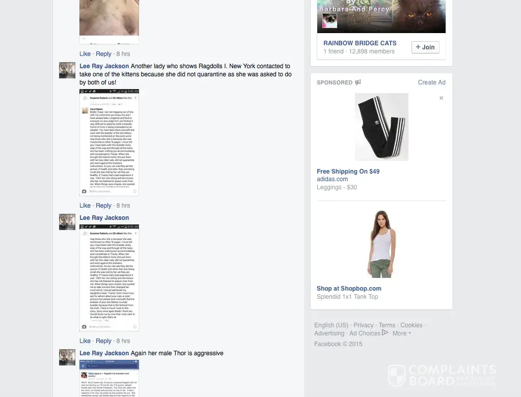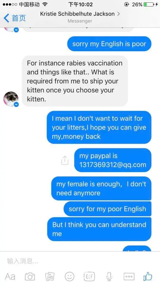 This "breeder" has been scamming people all over the globe. My friend Bill was bold enough to share his story on Facebook and now people are coming out from all over the world with similar stories. She was using 3 PayPal accounts and they have all been frozen permanently for suspected fraudulent activity. She is being investigated by the FBI. She preys on the vulnerable because she thinks they don't know how to navigate the criminal system. She appears to understand PayPal policy very well - to work transactions in her favor. For example, PayPal won't protect a buyer if they make split payments - so she asks for split payments. She also appears to understand that PayPal won't protect transactions older than 180 days so she promises a kitten and then comes up with reasons for why she doesn't have a kitten yet - until the 180 days is passed and the buyer is unable to get a refund.