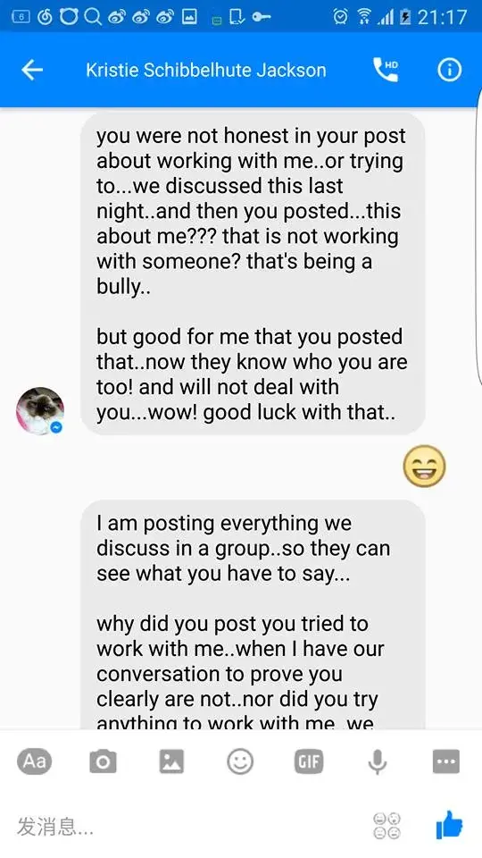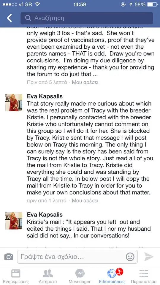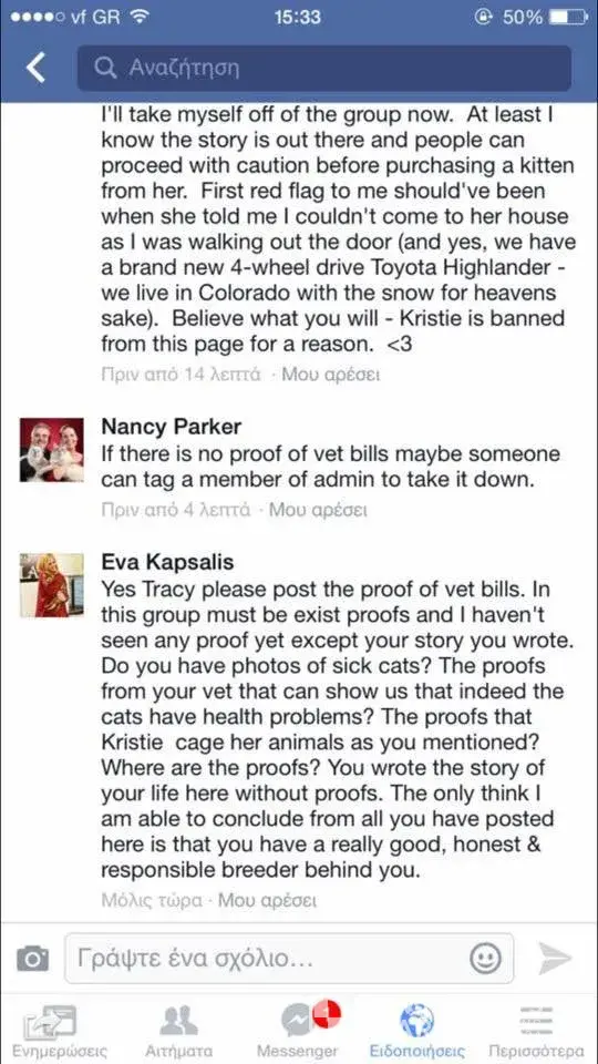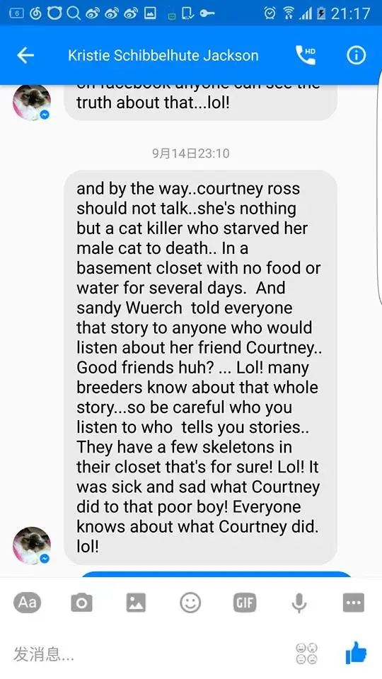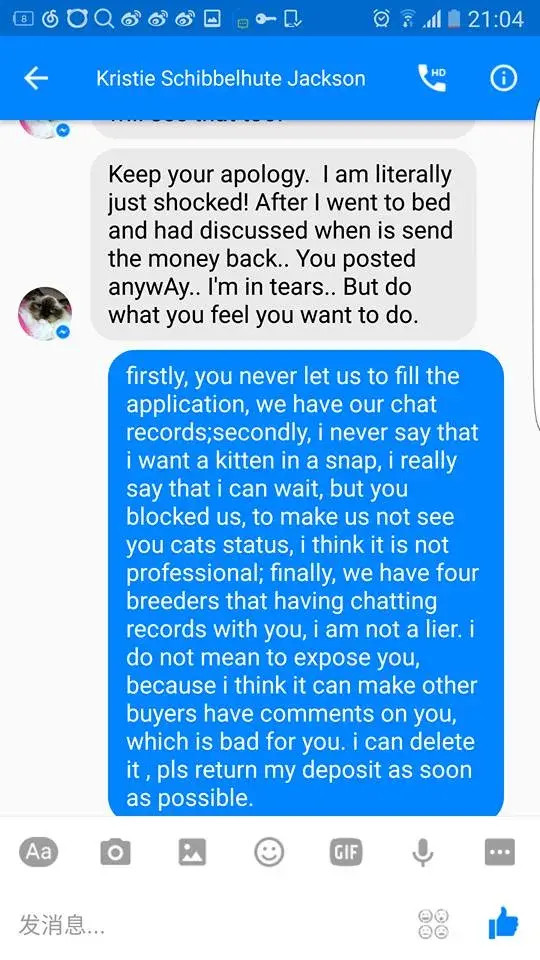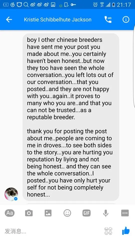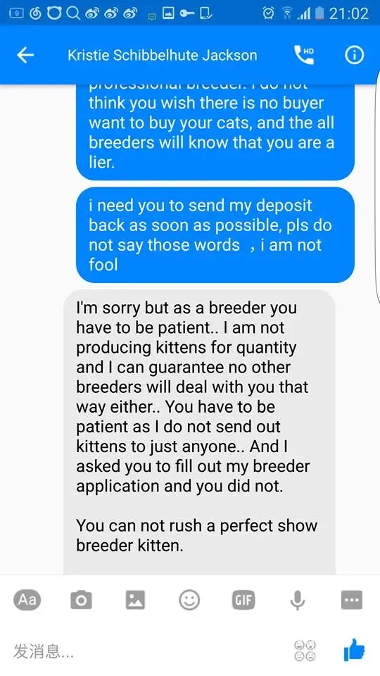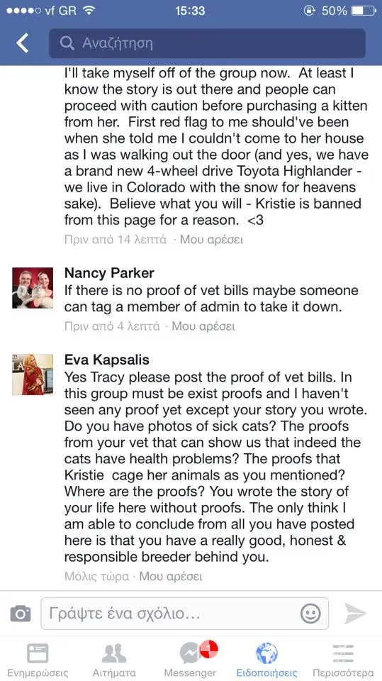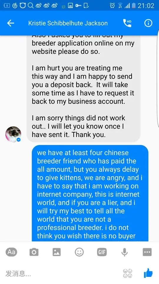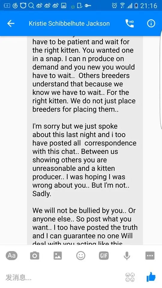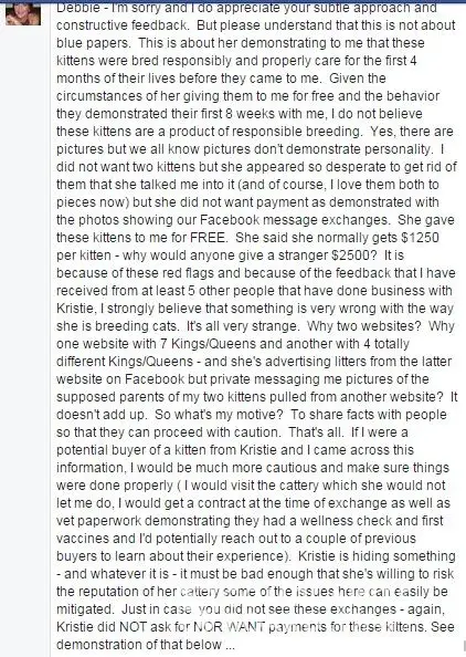 This will be my last post on this thread. I have accomplished what I set out to do which was to raise awareness about this breeder so that consumers could proceed with caution, not react and purchase or acquire a kitten from her based on emotion but rather do your research. Please make sure you network and ask questions, visit her cattery - if I've learned anything in the past couple of months, I've learned just how small this community is and it's not difficult to get the information you need - I wish I would have but I learned from my mistake and hope to prevent others from making the same. When you look at the extreme that Kristie has gone to try to defend herself, it becomes pretty clear who is telling the truth. An ethical breeder that didn't have anything to defend would not work as hard as she is to try to deflect the attention from her and put it on others. Please see the attached correspondence from others that have freely offered information to me that demonstrates this is her typical pattern. This is feedback that I have received from breeders and buyers all over the globe. I am not alone in my dealings with Kristie.