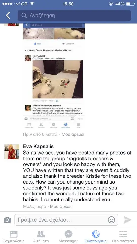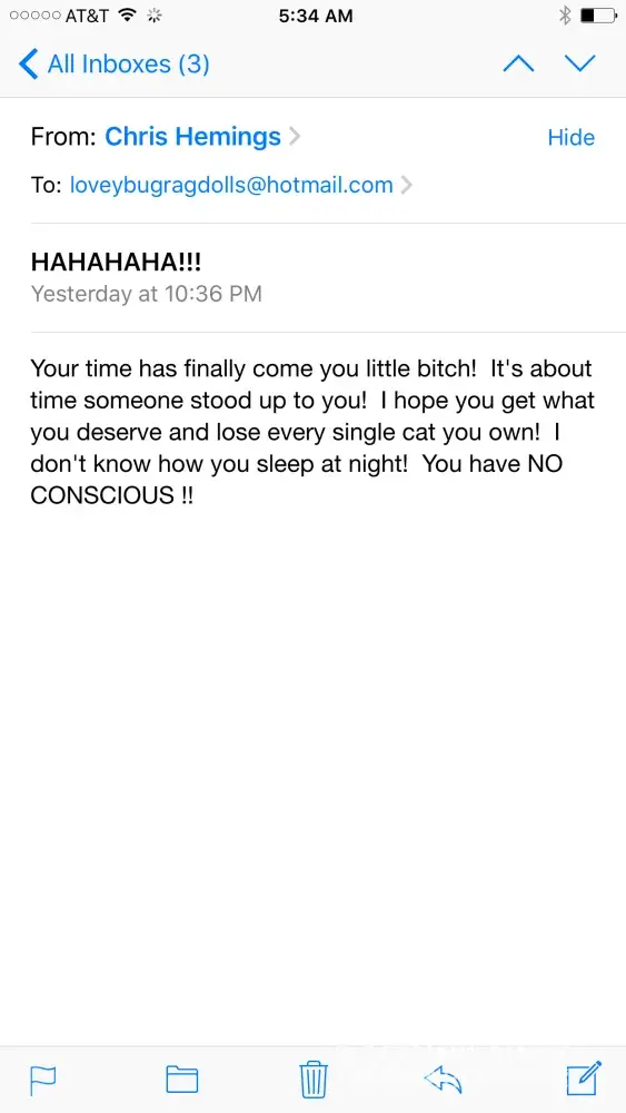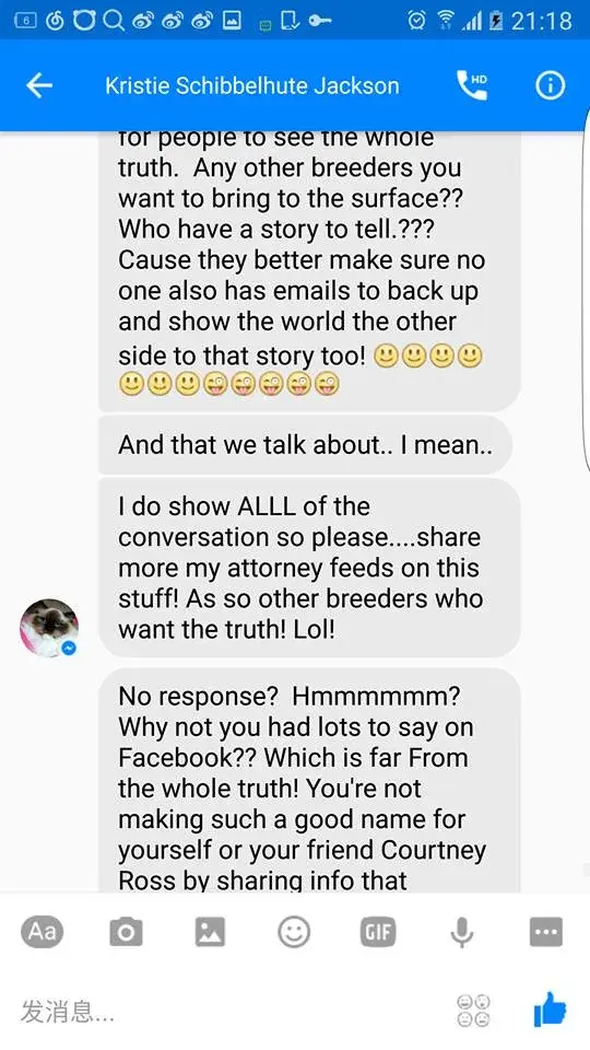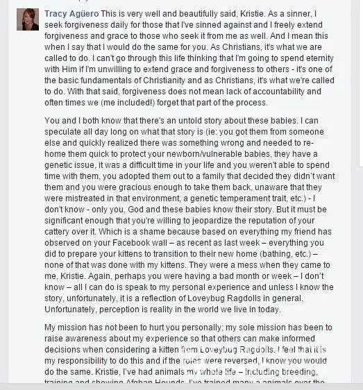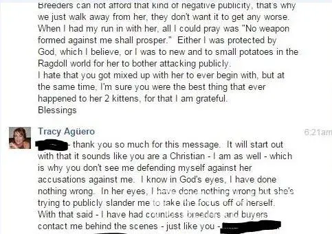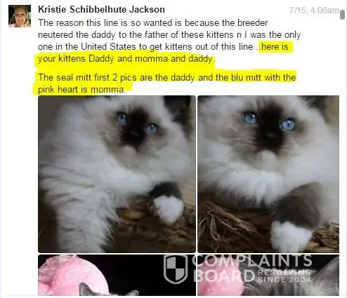 This will be my last post on this thread. I have accomplished what I set out to do which was to raise awareness about this breeder so that consumers could proceed with caution, not react and purchase or acquire a kitten from her based on emotion but rather do your research. Please make sure you network and ask questions, visit her cattery - if I've learned anything in the past couple of months, I've learned just how small this community is and it's not difficult to get the information you need - I wish I would have but I learned from my mistake and hope to prevent others from making the same. When you look at the extreme that Kristie has gone to try to defend herself, it becomes pretty clear who is telling the truth. An ethical breeder that didn't have anything to defend would not work as hard as she is to try to deflect the attention from her and put it on others. Please see the attached correspondence from others that have freely offered information to me that demonstrates this is her typical pattern. This is feedback that I have received from breeders and buyers all over the globe. I am not alone in my dealings with Kristie. Kristie claims to be a "Hobby Breeder" - anyone can hide cats and clean up their environment to make it look like a cute little cat boutique to impress the inspectors - especially when they have a week to prepare for the inspection. Hobby breeder or not, I have experienced first hand the type of cat/kittens she is breeding and their behavior/character is NOT in alignment with the standard Ragdoll temperament. And finally, Kristie - this is directed towards you. By mentioning my employer, who has nothing to do with the exchange of these kittens, you have finally crossed a line that will not be tolerated. I have an attorney who has been sitting on the fence that will gladly take it from here and engage representing both me and my employer. And as long as I'm willing to pay for their travel, I have plenty of people that are willing to join me in a courtroom to share their experiences with you. I am handing this account over to my attorney on Monday who will monitor the posts going forward from here.
