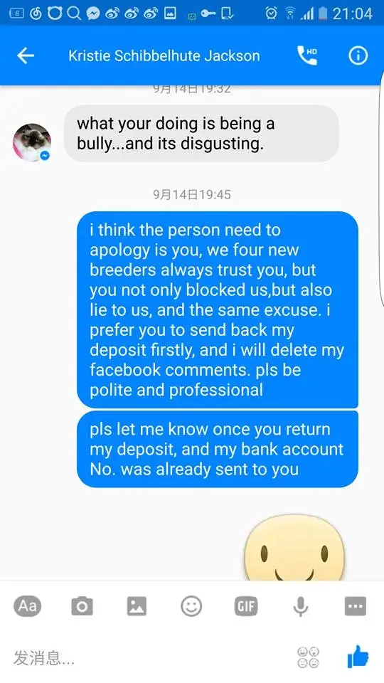 Then she told me the bad news that the mother wasn't pregnant as planned. I continued to ask her if the cat was pregnant up until September and her response was always "no". I decided to ask for a refund because I did not want to wait so long and Kristie wasn't initially honest with me. She refused to give me a refund, she told me again that the mother is pregnant and that i should wait a few more days.