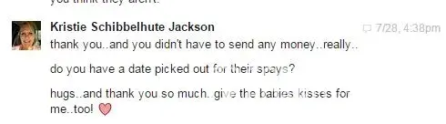 I have attached a comment on 7/28, from Kristie to me, once again indicating that she did not want payment for these kittens.