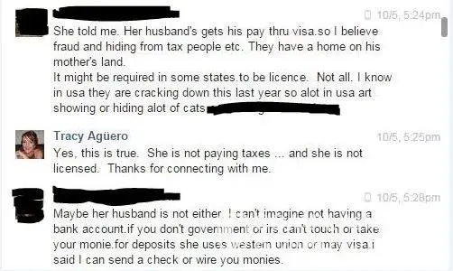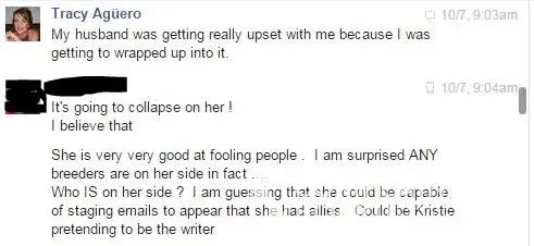 Tracy now threatened me that she will get her high priced attorney, since I mentioned her employer? just as she is mentioning mine all across the internet.lol! and posting personal and private conversations she had with other breeders, Tracy also posts private messages of these breeders, which you can lighten up the black out and see clearly who these breeders are. lol! You should be ashamed of yourselves! However, I can provide proof in writing and photos and other breeders can vouch for those particular breeders unethical breeding practices! Pleas email me privately for that info. or visit us online to request that info..