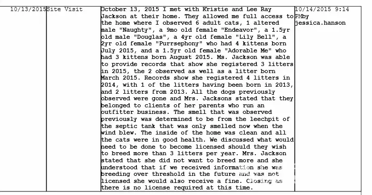 I think this "snip bit" (see photo with partial copy of the report) from the USDA/PACFA investigation speaks volumes, which is what the investigators found during an UNPLANNED and UNSCHEDULED visit to Kristie's home. The full report and results of the full investigation, including what was found during the PLANNED and SCHEDULED visit to Kristie's home can be found by requesting it at the following link: