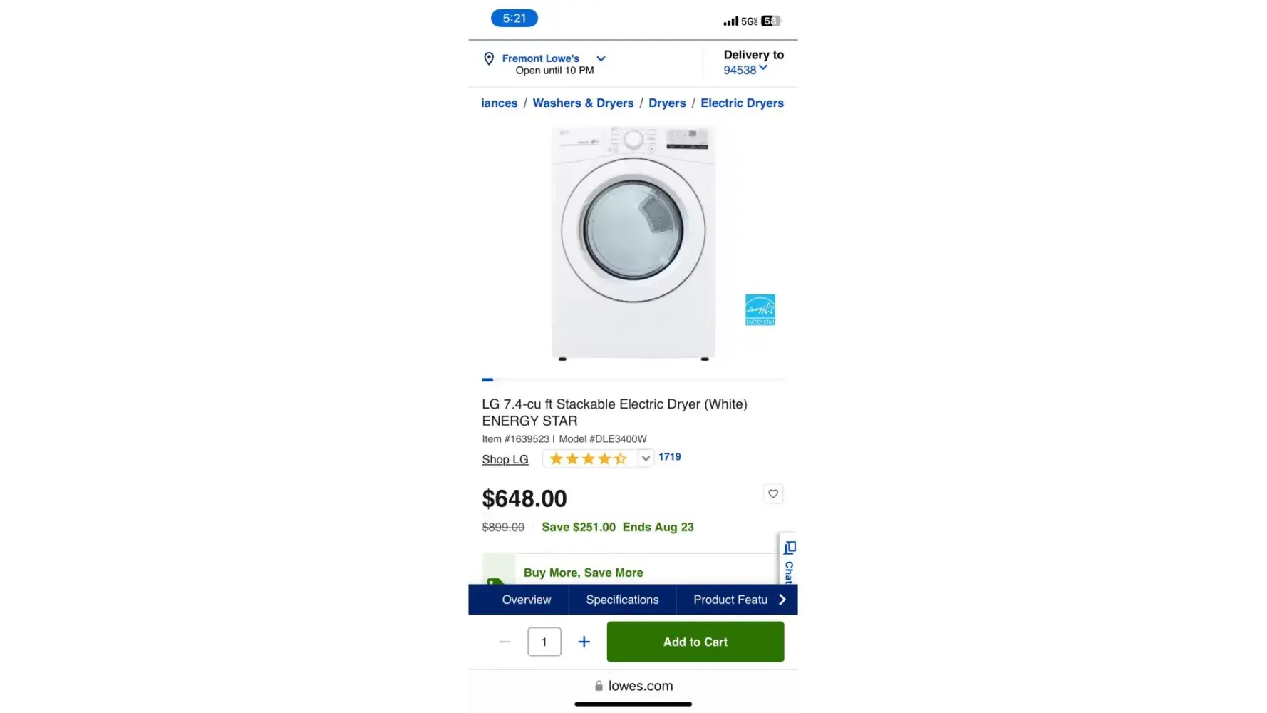 The item is clearly marked as $648.00 with free delivery. My newly issued Lowe's credit card was grossly mischarged. The salesperson said don't worry we will correct. The 'correction' priced the item correctly, then was I was issued my new credit card 'credit', then I was erroneously charged a $99.00 delivery fee. Lowe's owes me the erroneously charged delivery fee. I have taken the time to go to the store several times and spoken with several so called 'managers' that have stated that I am owed the mischarged delivery fee. All the employees blame the computer system and mangers that do not know how to operate the said computer system.
