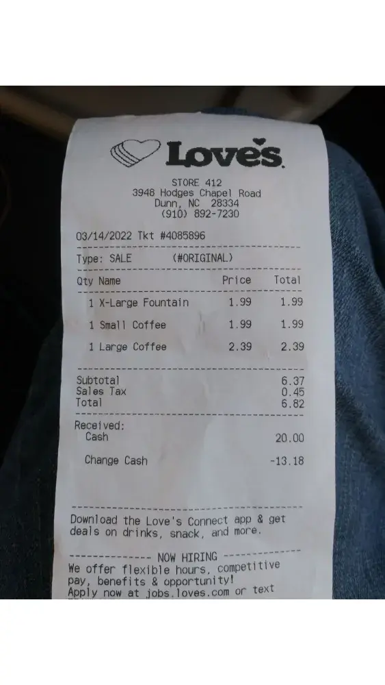 In my 30 years of being a truck driver I have never experienced such rude and hostile behavior at any Love's truck stop till this morning. I was at Loves 412 truck stop (Dunn, North Carolina) and the cashier FLO was rude and even when I needed some half and half for my coffee she took out this bag from the machine and rudely told me use what was left in the bag and the price she charged me for it was ridiculous. I have never been charged $4. 38 for a coffee being out on this road.