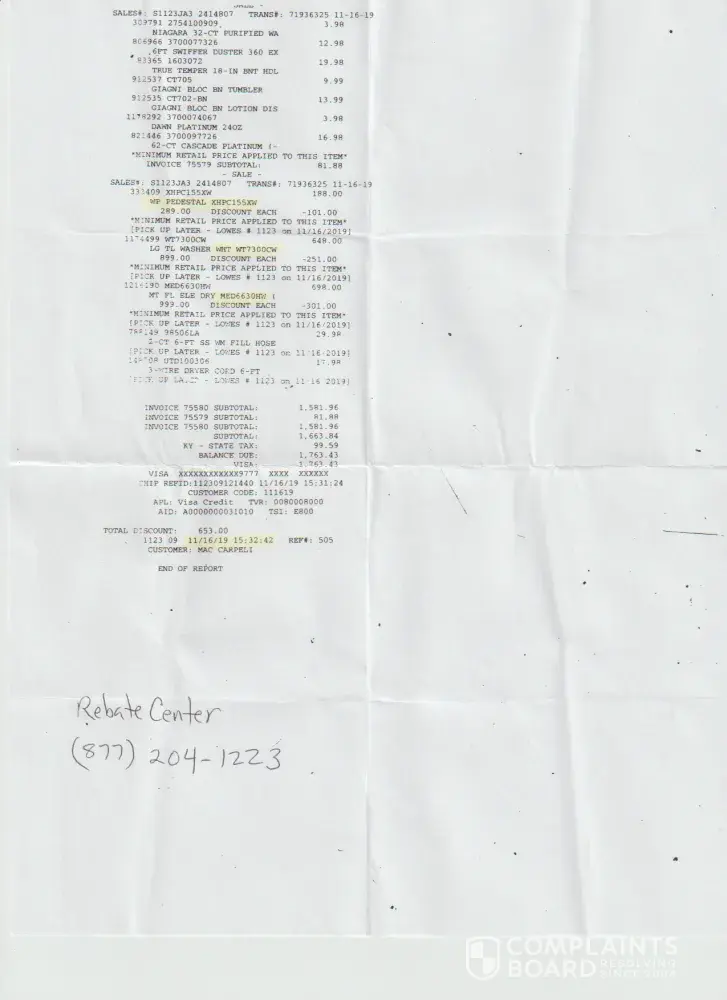 This is my personal and unique opinion of Lowe's Home Centers, LLC 350 Diedrich Boulevard Ashland, KY 41101 also known as Store Number 1123. This opinion was formed based on my recent personal experience with Lowe's. On November 16, 2019, I purchased an LG WHT WT7300CW washer, MED663HW dryer and XHPC155XW dryer stand from Lowe's. When the salesperson rang...