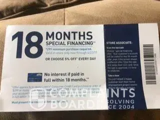 I received a special financing offer of 18 months no interest by mail. It says: " valid in-store only now through 4/22/17" with my Lowe's Consumer Credit Card, $299.00 minimum purchase required.