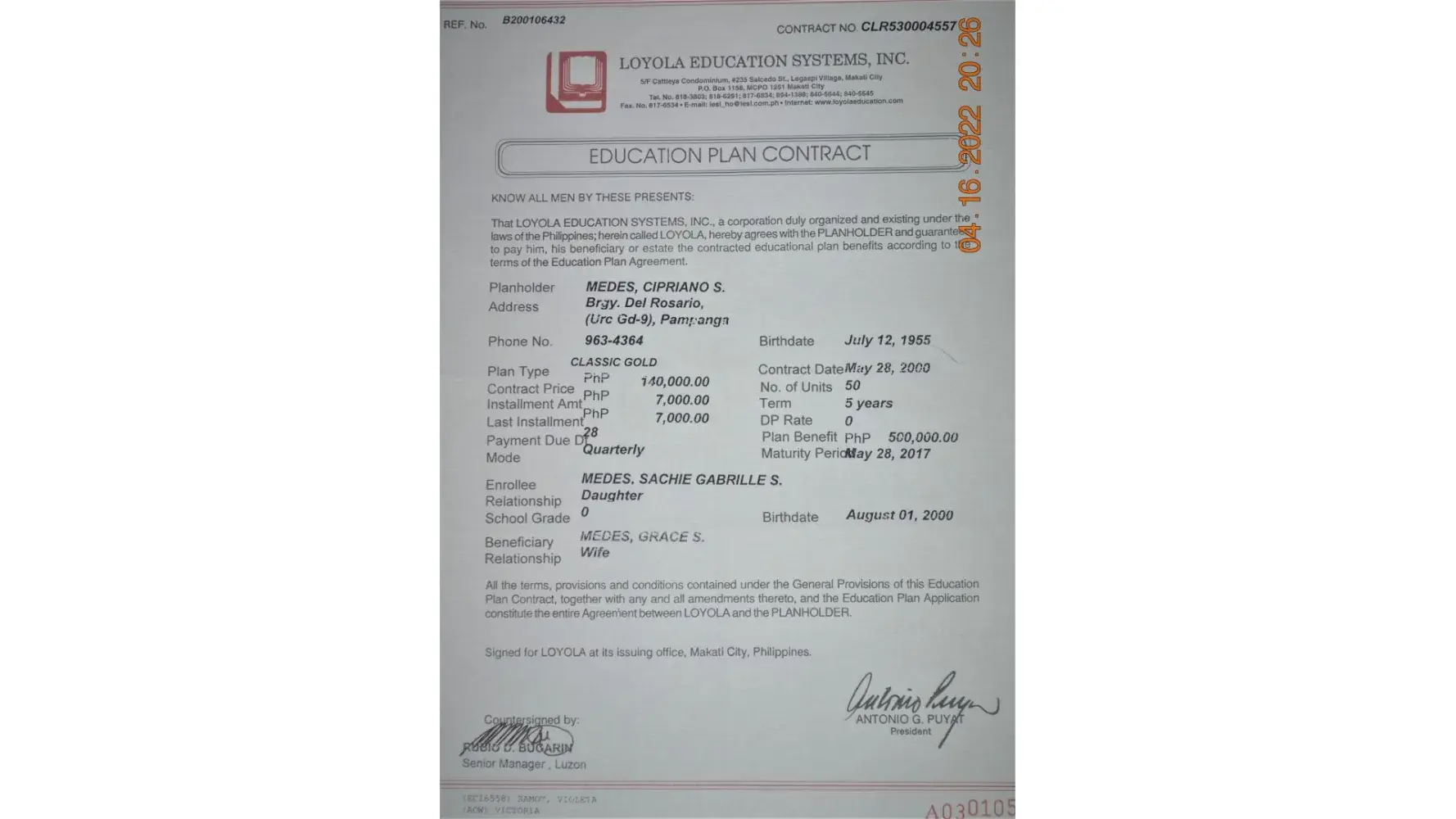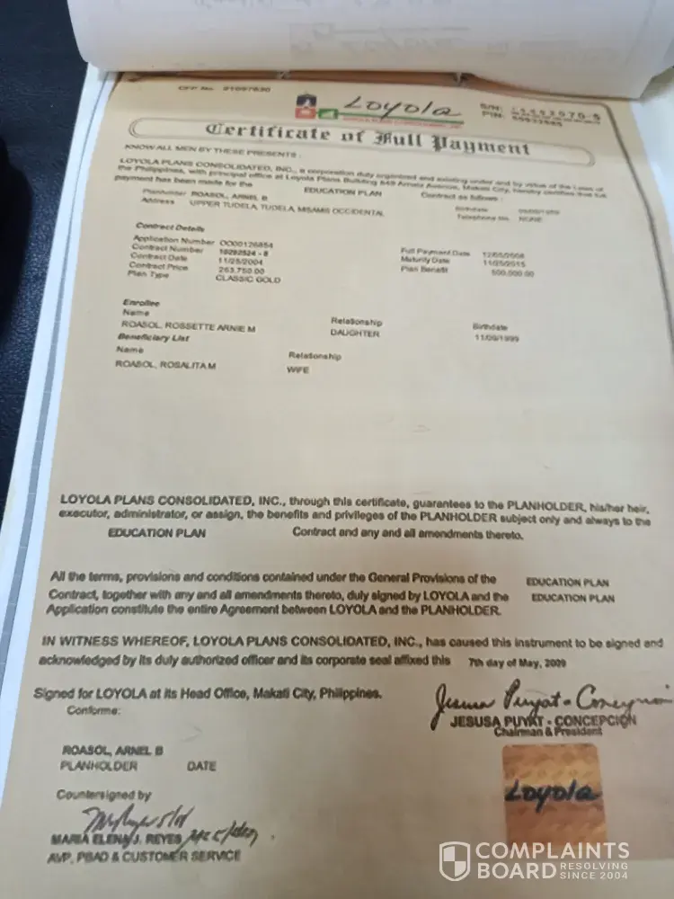 She still has pending claims from Loyola amounting to 225,000 pesos, she was supposed to get 75,000 pesos each year from 2015 to 2018. Since she was able to claim one time on 2015, she still has pending claims for 2016, 2017 and 2018 each amounting 75,000 pesos that we still weren't able to claim. My mother followed up couple of times and even went on their office in Poblacion, Makati to follow up on the payment. But same response was given, Loyola is still in bankruptcy and is still selling properties as of the moment. This is purely unfair and not a valid excuse because we really struggled with money, my mother paid for my education plan rightly. I had to stop my education since we do not have the money that was supposed to be for my tuition. And because of that I am still an undergraduate, I had big dreams ever since I was in high-school and now I am planning to go back to school but we wanted to resolve and get the pending claims from my education plan in order to proceed.