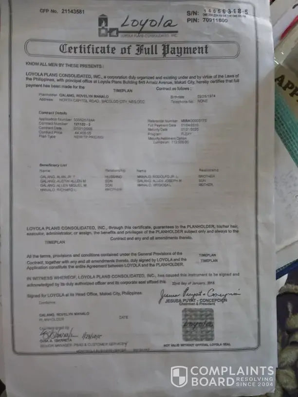I would like to complain against Loyola Consolidated plan regarding the claim if benefit we file last April 2020 upon maturity if my time plan We already submitted all the required documents including the funeral plan of my mother and verified and agreed by them and told will release the money by that month but until now no answer. The educational plan was not paid fully by the company. I kept sending them email but no reply and the office was closed. I suffered from serious illness and I need the money for my family.