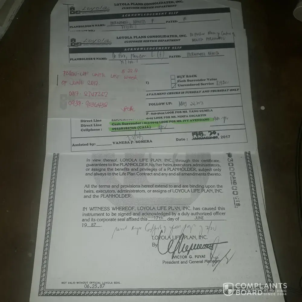 Last January 18, 2017, he went to the Loyola Plans Office to file his Cash Surrender Value. He was given an acknowledgment slip stating that he can follow up on April 18, 2017. His cash surrender value indicated in the slip is P22, 500. However, when we follow up by the phone numbers that was indicated in the slip, we cannot contact such numbers.