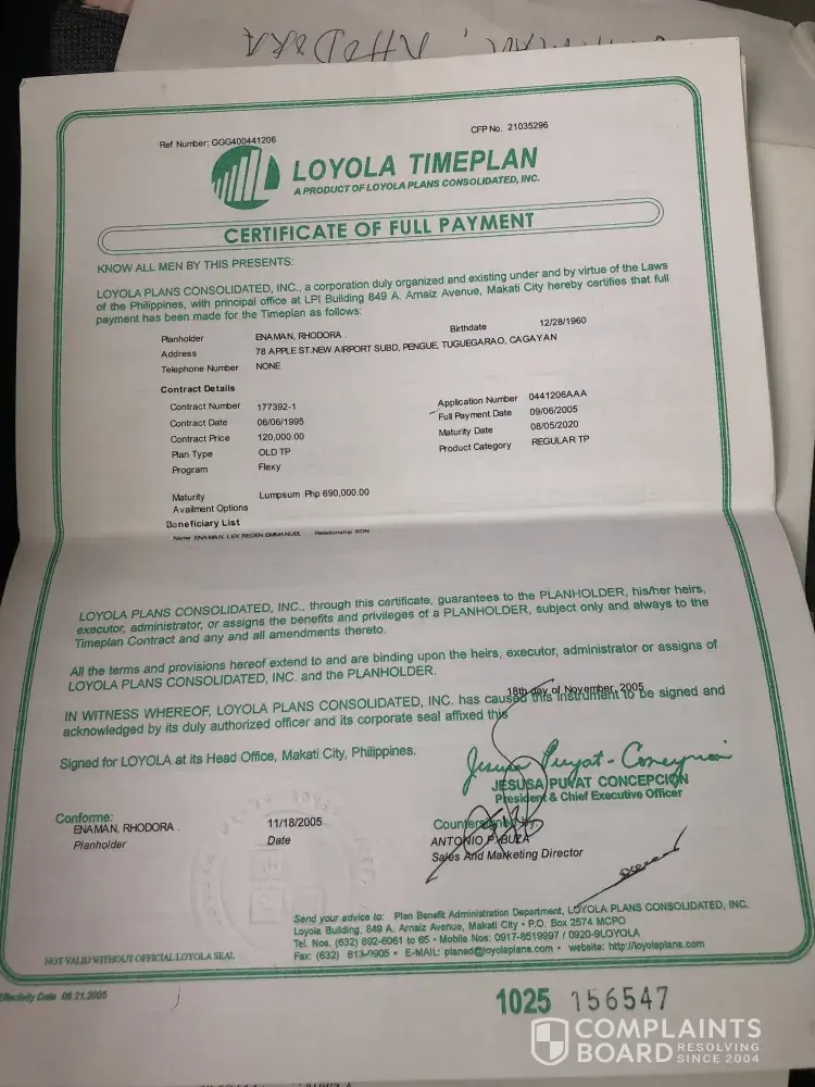 I am Rhodora Enaman with Cp number [protected]. I have a Loyola TIMEPLAN Contract with Loyola numbered 044120-6 or 177392 (as given to me by a certain GUADA with whom I was able to talk last year at LOYOLA's contact numbers at [protected] and/or [protected]. I paid the gross price of P120, 000 or (P1, 040/monthly for 10years). The date of my contract is June 6, 1995. The maturity date is August 05-2020. I have been contacting Loyola every now and then at their aforesaid numbers and searching the web where or how to contact them but to no avail. Their given numbers keep on ringing with no one answering. Please, help me and my fellow timeholders who cannot also claim the benefits due us.