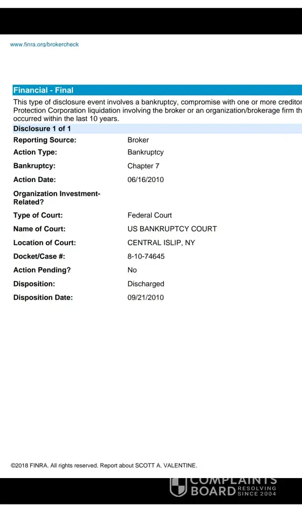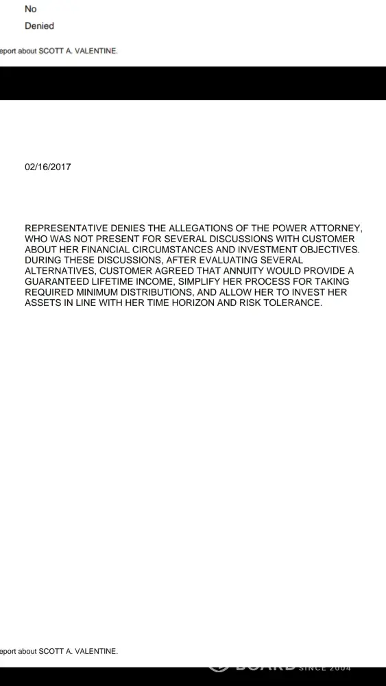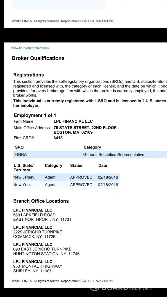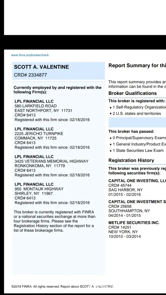 Scott Valentine who works for LpL Financial Inc is out in the long island area selling people retirement plans they don't need! Best of all after he completes a deal with a client he will share there information with his friends and make fun of the client.please investigate online all about Mr valentines complaints, bankruptcy, and his low score with his company.one of the complaints states Valentine forged a customer's name.im going to put a link on here I'm not sure it will come out.just copy it and read.thank you a consumer who got away from valentine. https://app.wealthminder.com/financial-advisors-islandia-NY/scott-valentine/320676