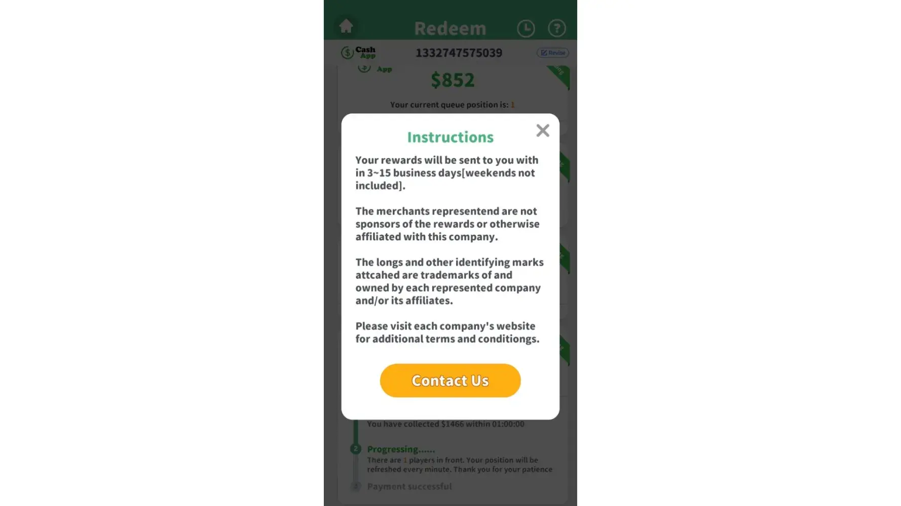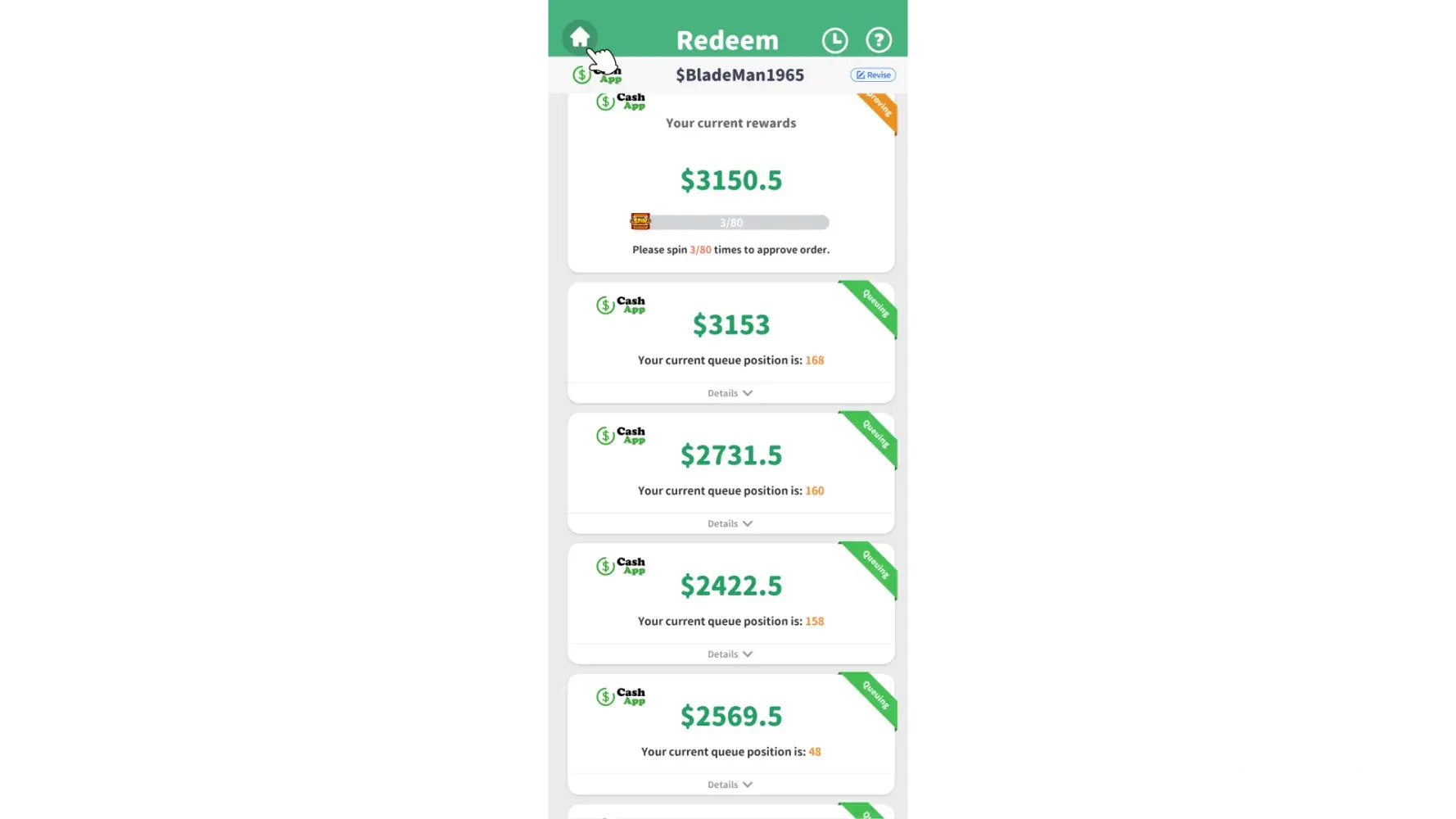 I'm dealing with the same thing. Spun the "required" number of times to "process" the payment then the ads then it said 2 days it would go to my CashApp and now it says I am like 5,518 in then que or some ridiculous number like that.