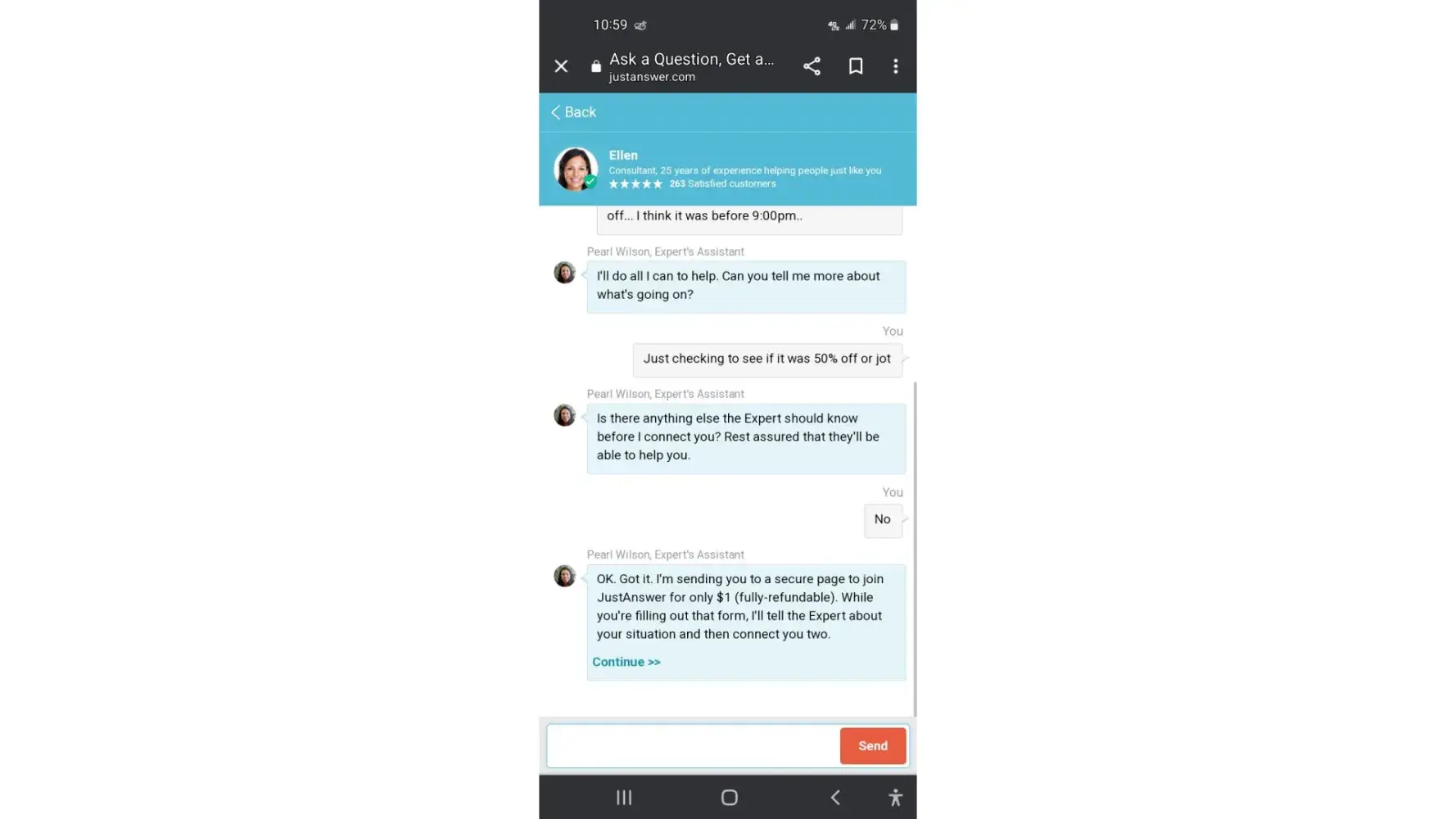 Contacted Customerf Service through Chat to aske a question about my last transaction to see if it was before 9 o'clock so I would get the 50% off, since I had signed onto website with promo from my email. The assistant the asked I'd there was anything else that the Expert should know. I said, No... she the typed that there would be a $1charge (fully refundable). So I gave them my credit card #. Then I had an alert on my phone that not only was there the $1 charge, but a $28.00 charge as well. I didn't even talk to the Expert. I then locked my card and then she tried to bill me a second time for the same $28.00. Lucky I had locked down my card... can I please be refunded the $28.00?