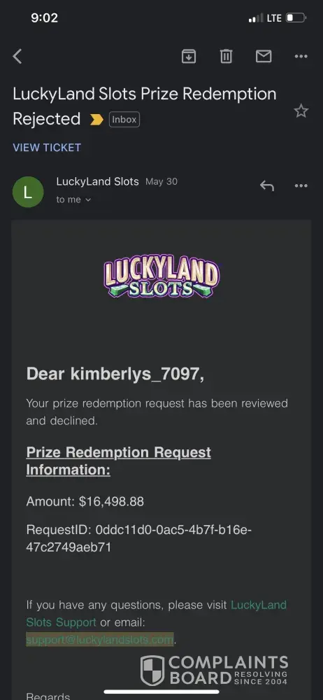 On May 29, 2021 at around 2 pm I played luckyland slots an I was playing Cai Shen La. A game I would usually skip over but I didnt I decided to bet big so I did an I started off betting 50$ a spin. The results of me doing so lead to a $16, 498.88 gain I was happy until luckyland denies my redemption an closes my account. I didnt know what to do an still dont know what steps to take or who to contact about getting my money. This is unfair an shows they have no integrity. I have been waiting over 2 weeks an still I have not received my redemption. Can someone please guide me in the right direction?