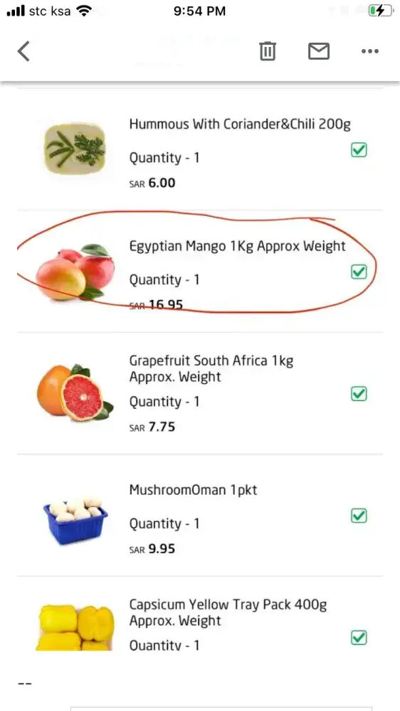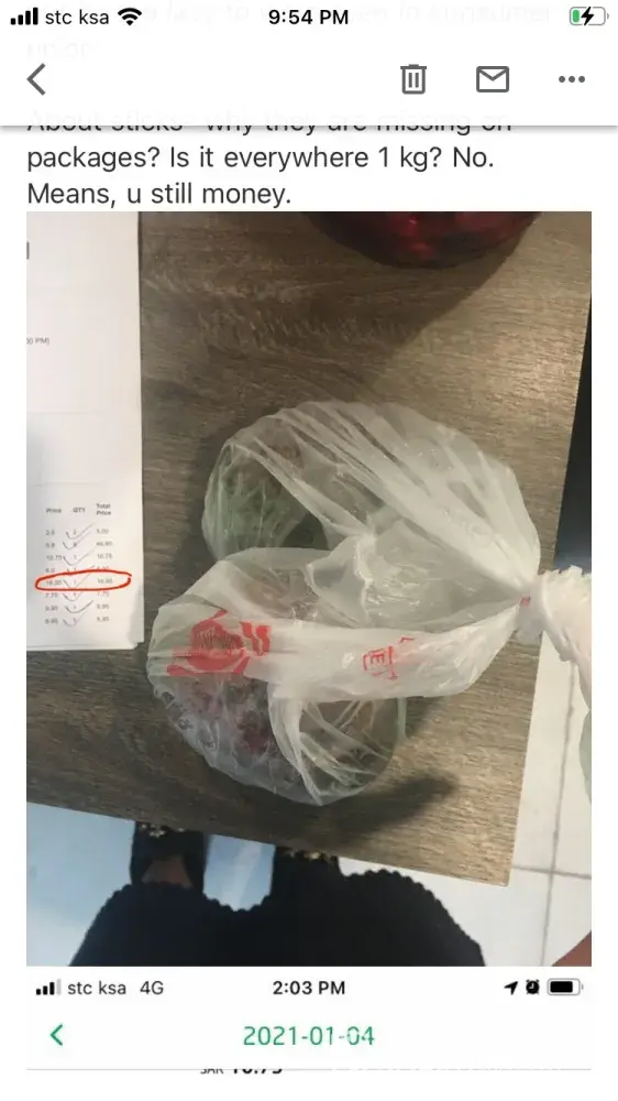 I ordered mango. Mango I got are totally other type, but in the bill- same as I order, also there are no stickers about weight, and this 2 mangos are not 1kg. Same situations happened before, so time to say!