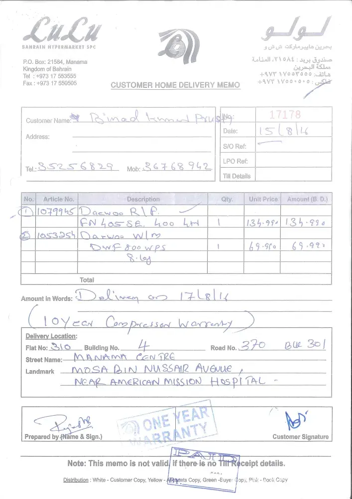 Lulu manager provided number of Bahrain Gas and I had delivered the refrigerator to Bahrain Gas and Bahrain Gas Mr Dinesh told me over phone that the compressor has gone and it will cost 45 BD + VAT.