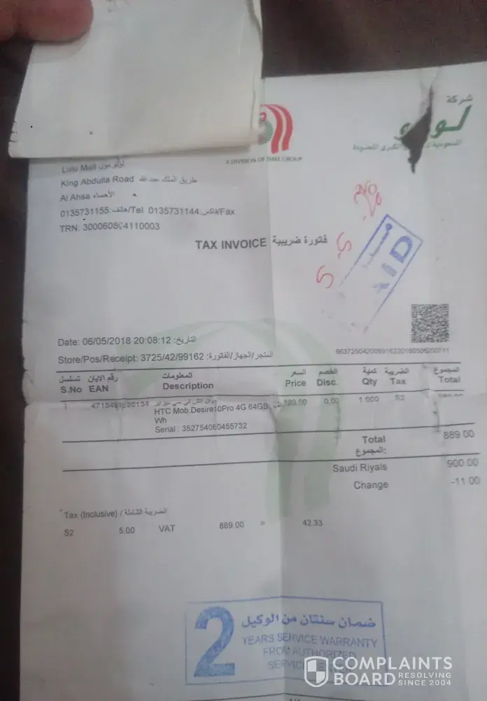 HTC mobile on 06/05/2018 my warrant going to finish 06/05/2020 from last month I am went 3 time to give the mobile to lulu customer service but the didnt accept they told me next due to corana crices all service center are close