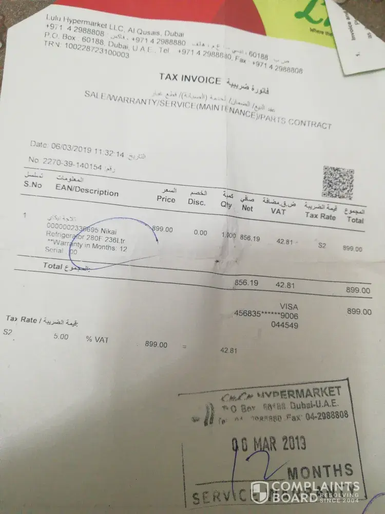 This is to inform that we had purchase a new fridge (refer to the inv [protected] dt. 06-03-2019 attached ), from the day one we r facing problem with fridge lekage we trying to contact many times for service since once the service is done yet the problem is not solved. We try to contact customer service lulu brach al Nadha sharjah. Still we have very bad responses from nikai service team. Am a regular customer for Lulu since 8 YRS. Kindly request to do the needed as earlier as possible. We appreciate for your immediate attention to this matter and responce