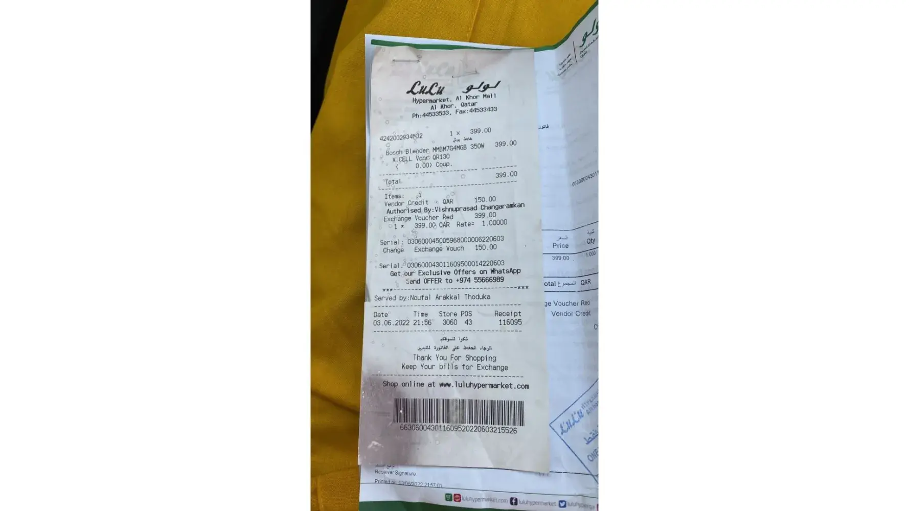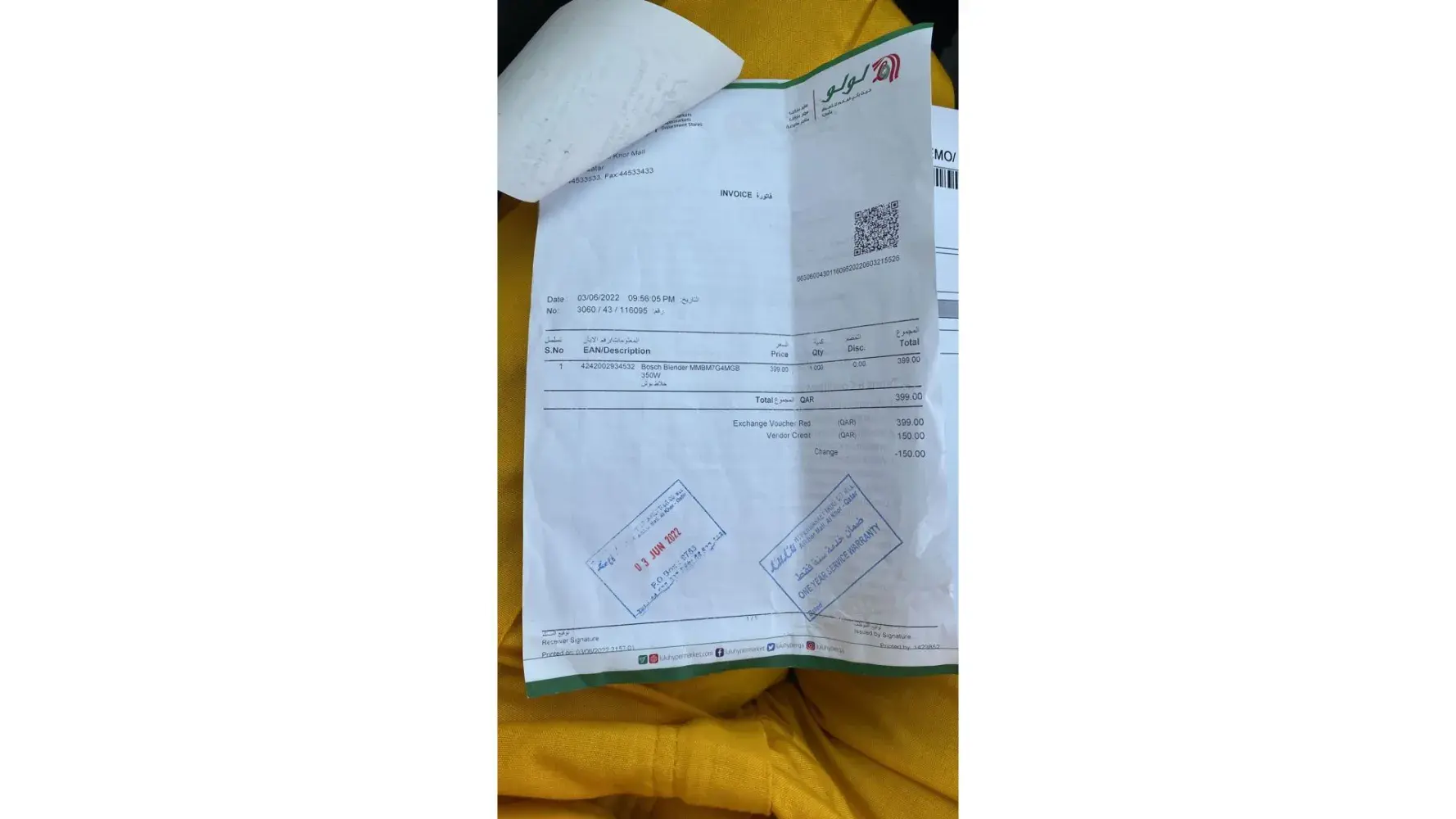 Please be informed that I have purchased the subject Item Bosch Blender (Bosch Vita Style Mixx2 Go) on 03-06-2022, From Lulu Al Khor and on the same time i sent to my native country Pakistan. But when i reached there and the item did not start and not even work for one time. But when i go back to LuLu to return they said they can't help and it will not be change. I am sure the that this was ON sale item and LULU repaired it and the resale. And now LULU is not willing to change or return. Please help me out to solve my Issue.