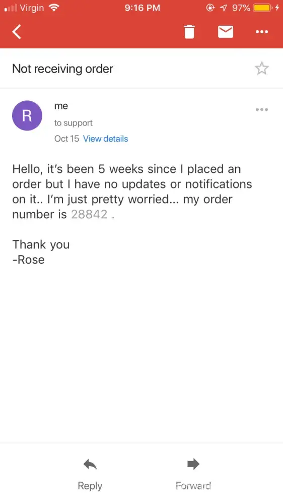 This company is a total scam! Don't waste your money ordering from them. I ordered the double halo crystal ring on the 27/8/18 & today is the 9/10/18 & I haven't received my order. I've sent numerous emails, sent messages on Facebook & even Instagram, yet, no response.I regret not reading the reviews. Hence why I'm in this predicament. Order number: 28600