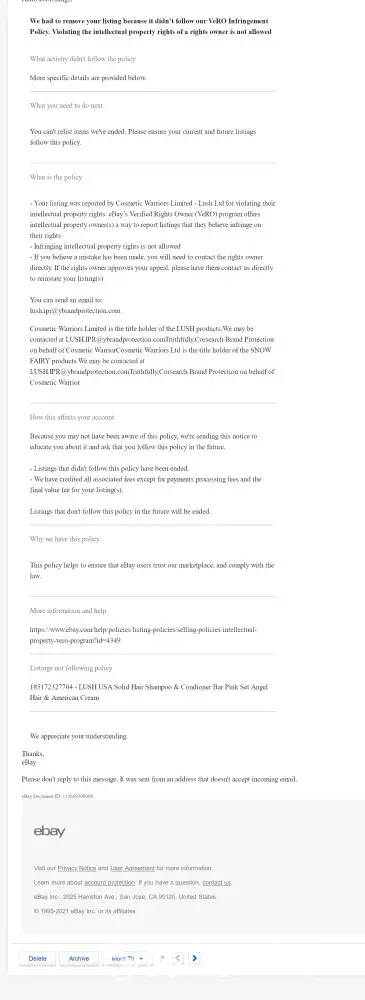 I sold LUSH items I bought on eBay from another seller but didn't use. They weren't trademark copies or violations. They were packaged in their original bags. I will never buy another LUSH product again due to this stupid email and I'm disgusted that eBay would send me a Verified Rights Owner (VeRO) warning message without prior verification or clarity on their part. Plus, removing a listing that sold at least a month ago? It's all very ridiculous and frivolous.