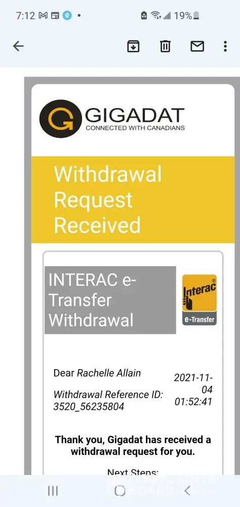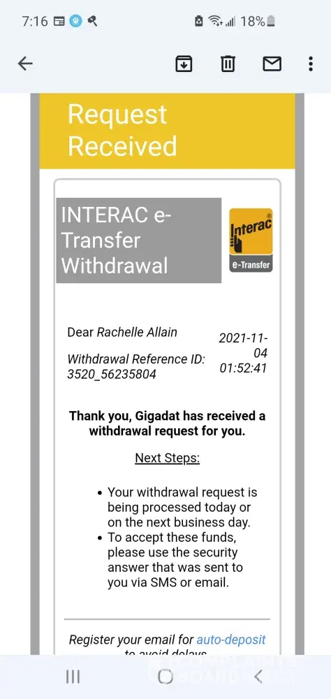 Email of successful withdrawl $150.00(my first 3 deposits)