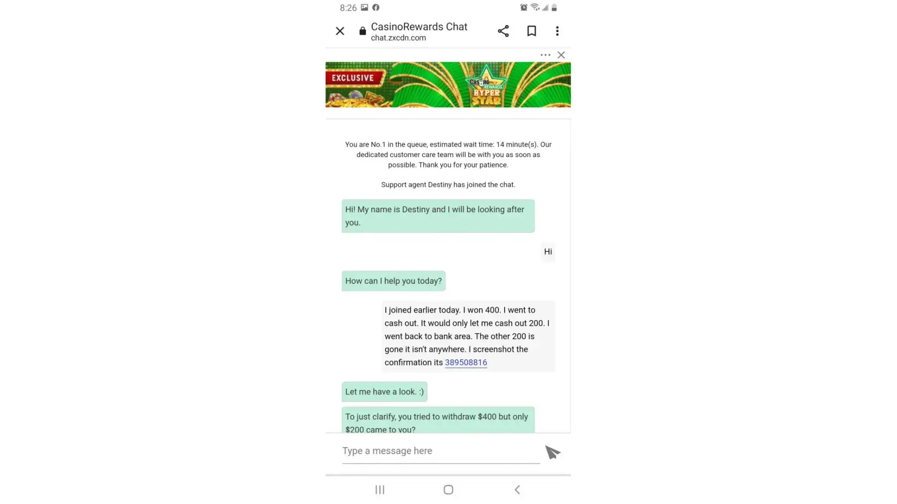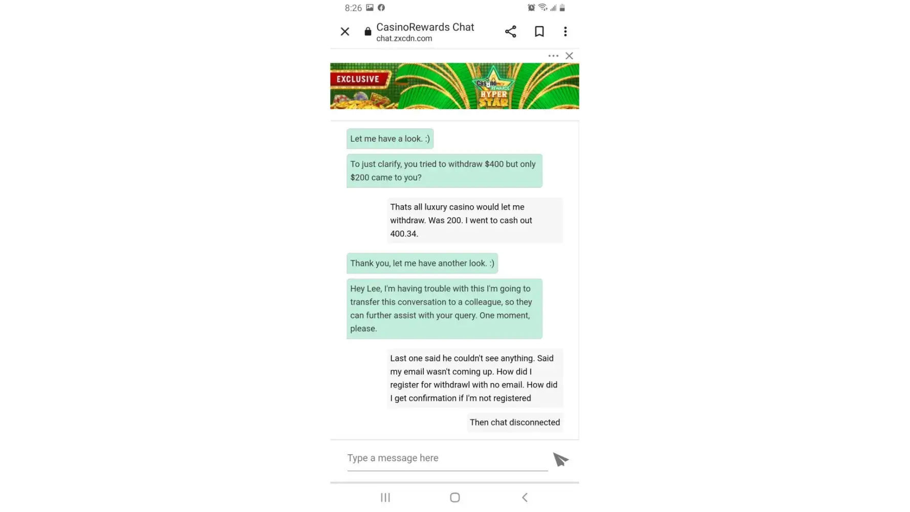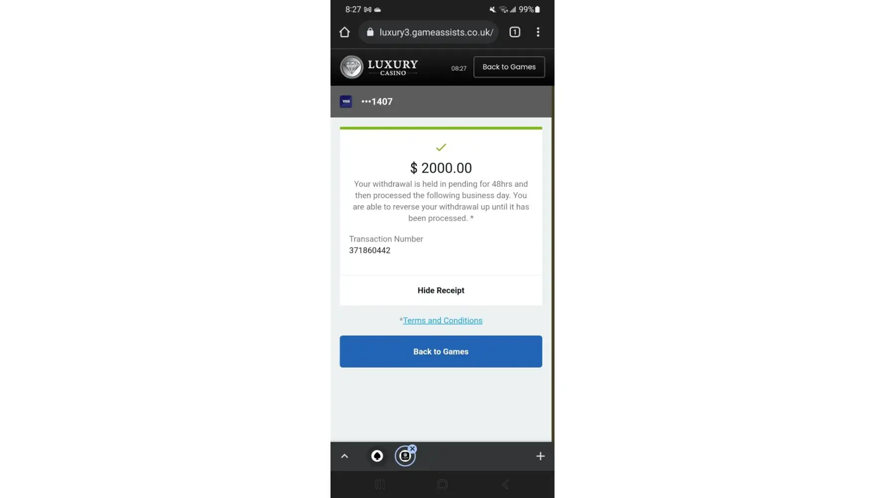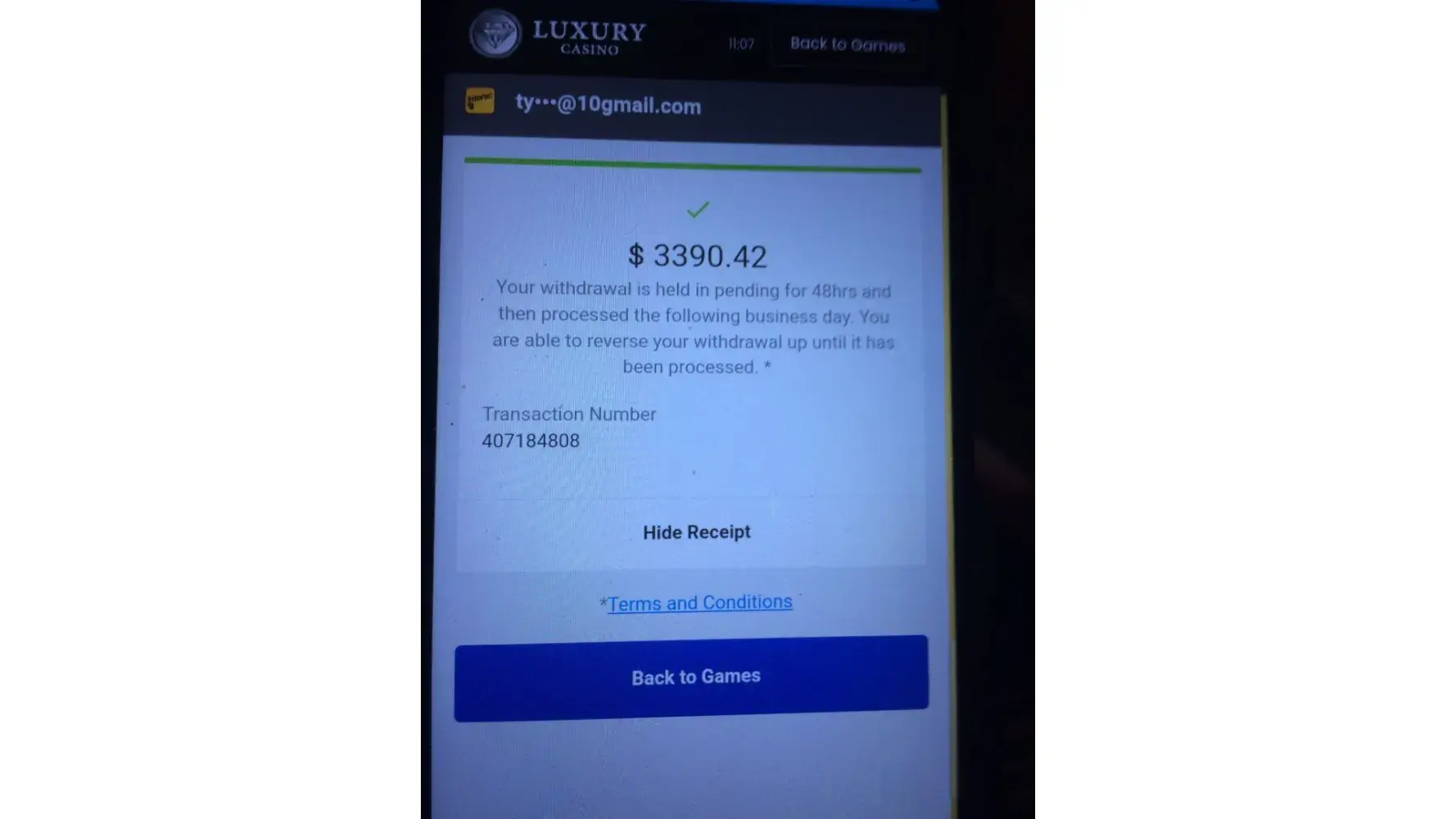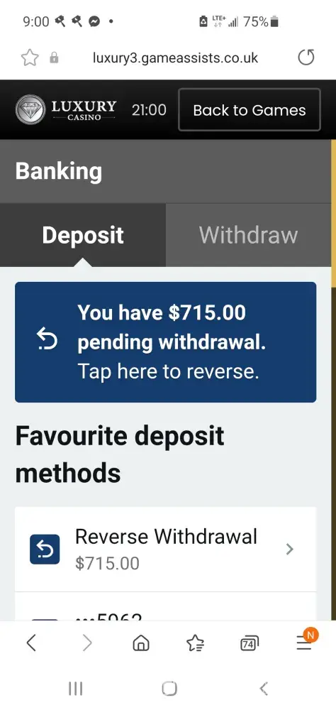 On the 18th August 2022 I redeemed roughly $40 from luxury casino. I played with this money got up to $600. I continued playing until I reached $350 to which I was then able to make a withdrawal. I made a withdrawal request for $350. I never received an email to confirm this. The following morning on 19 August 22, I made a reverse withdrawal of $25, I paid with this money got up to $68, I then made another withdrawal of $50 which made my total withdrawal request $375. I received an email confirmation for the $50 withdrawal request. Later in the day I log back in to luxury casino to then discover that the $375 is no longer in the account. I contacted the help centre, To which they said I had made multiple reverse withdrawals from the $375 and played with this money. They said I played on the same device and from the same location as I typically do. I said to them that this was not possible because I did not play or make any more Reverse withdrawals. I am the only person in my household, and I only have access to my phone and casino account details. They said to check the playcheck information to which I did. There was information on their suggesting I played one other game to which I never did, and this should not be possible as it never happened. I also said that I have never had problems depositing or withdrawing from this casino before until now, I’m not the type of person to be making false claims and ask them to investigate. I received an email from them saying exactly what the help centre had already told me. I emailed back asking them to investigate more deeply as I never played one of the games that lost all my money As I never made any more reverse with drawers. I also asked them to send me proof of the reverse withdrawals and account information, To which they have not responded. My theory is the casino did not like me winning money from redeeming their points. Maybe even someone from the casino made these reverse withdrawals and used my funds to lose the money so it would track on playcheck. However this has happened, I can assure that it was not me.