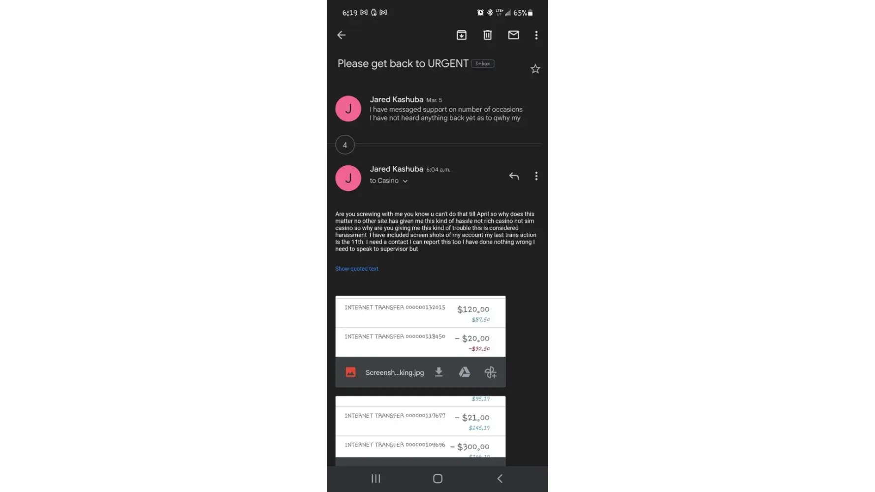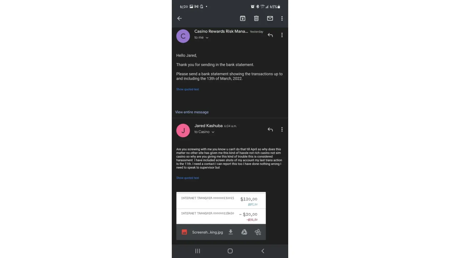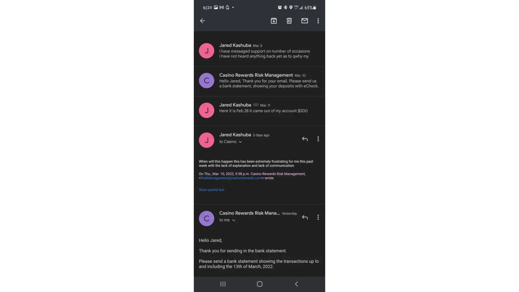 I had deposited money 200 to be exact I one 1300 in a day but then I withdrew 600 then all of a sudden my account was locked out and it took 2 weeks to have a response to me asking me to email my bank state ment showing the when I paid the 200 then when I did I get an answer 3 days later telling me they want a copy of my statement up until March 13 which has nothing to do with them or why didn't they ask for that then. with still no explanation why my account is being locked out I've had no explanation as to why I'm being treated like this. No other I online casino had had issues with me not rich casino not spin casino now they are asking for information knowing that bank statements always come out the month after so they are trying to delay my withdrawal even longer I'm going to report this to authorities soon as fraudulent it's been almost a month I need a contact to report this issue too to have this issue dealt with the contact name that's been email me is Kevin with risk management