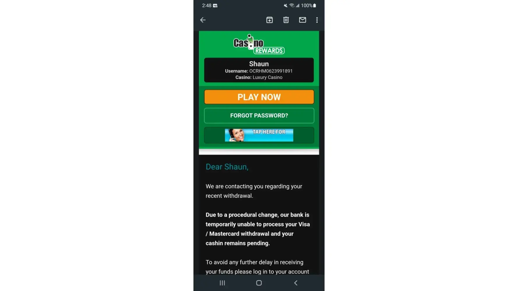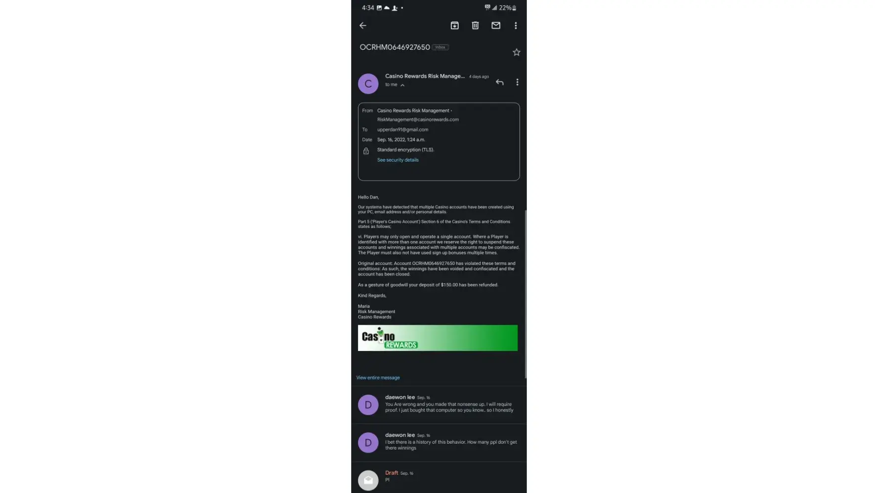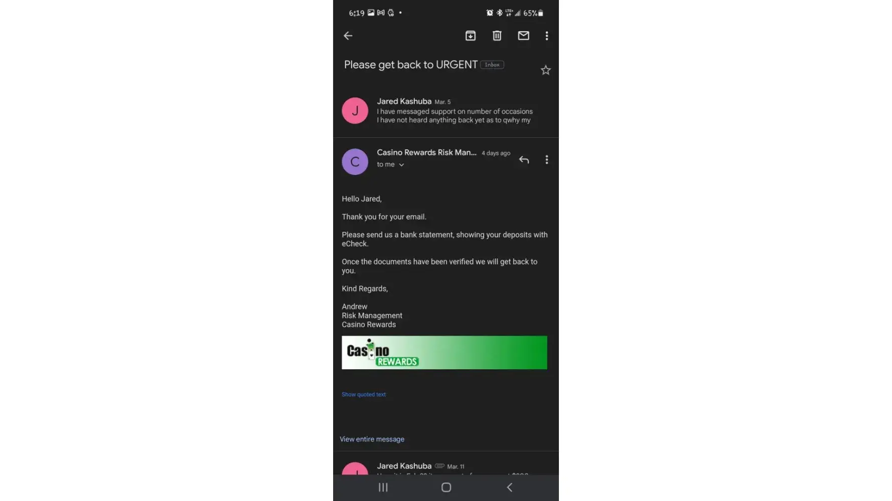 I am still awaiting any answer from Casino Rewards or Luxury Casino; Risk Management