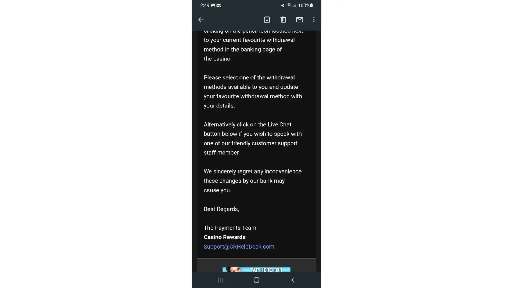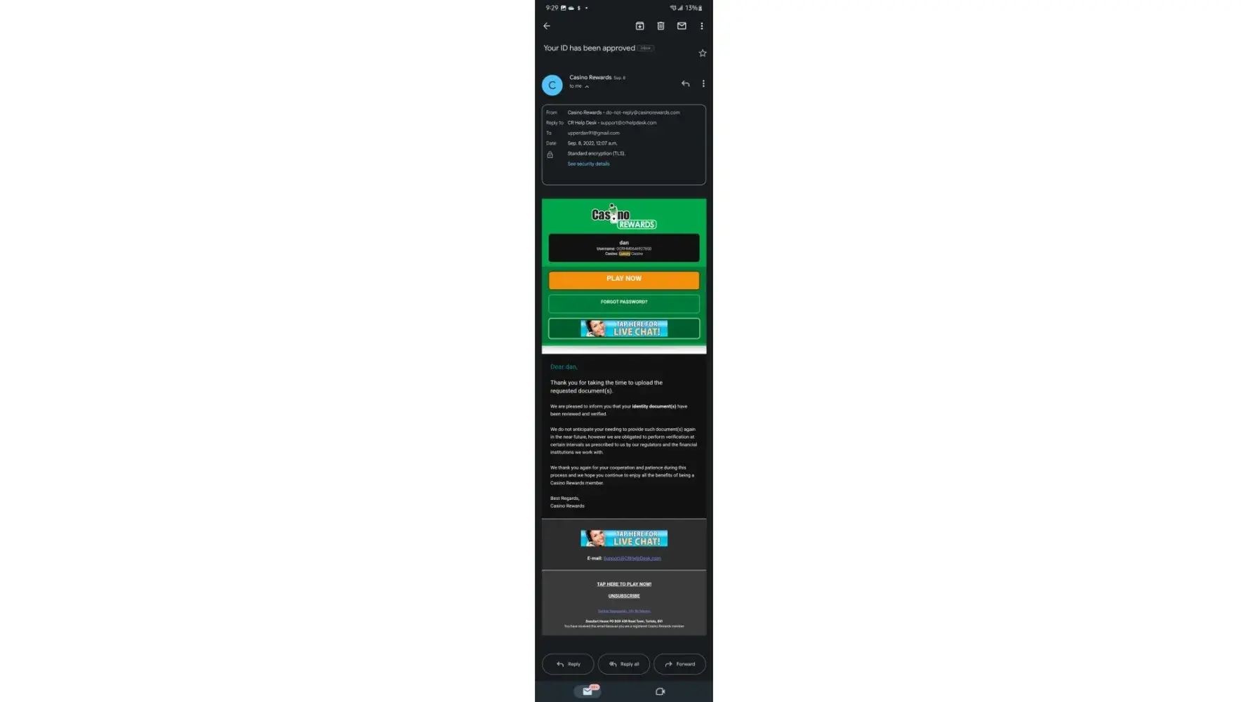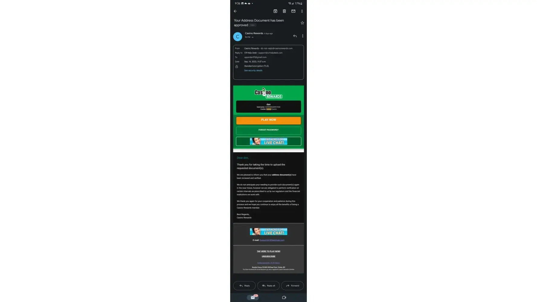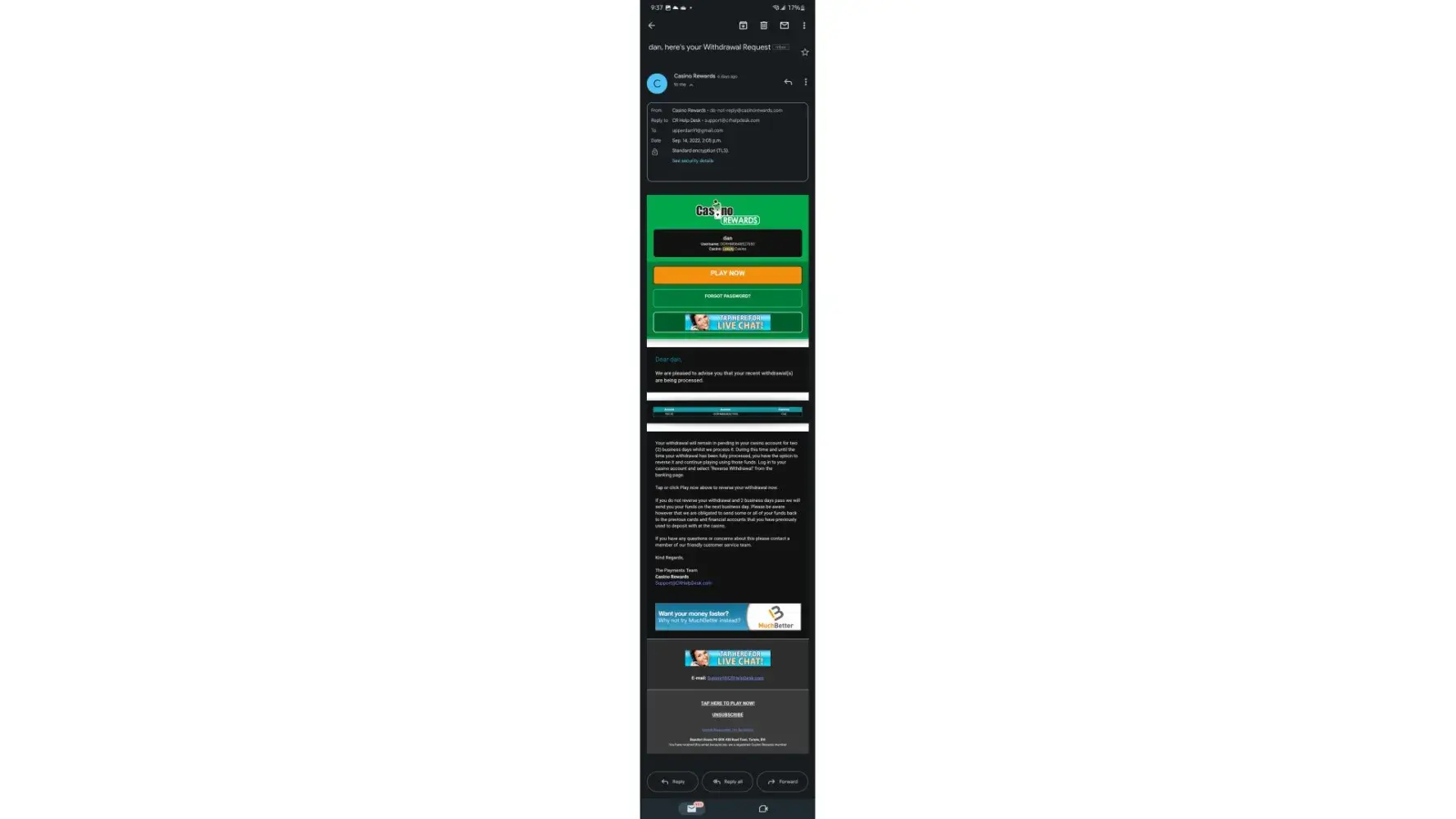 No will tell me anything and I've contacted [protected]@casinorewards.com and they haven't replied. I just want to be treated fairly. There have been similar cases where people still recieve their with drawl. Just minus some penalties. But I don't deserve pure 0.00 from $28000.00 that isn't right.