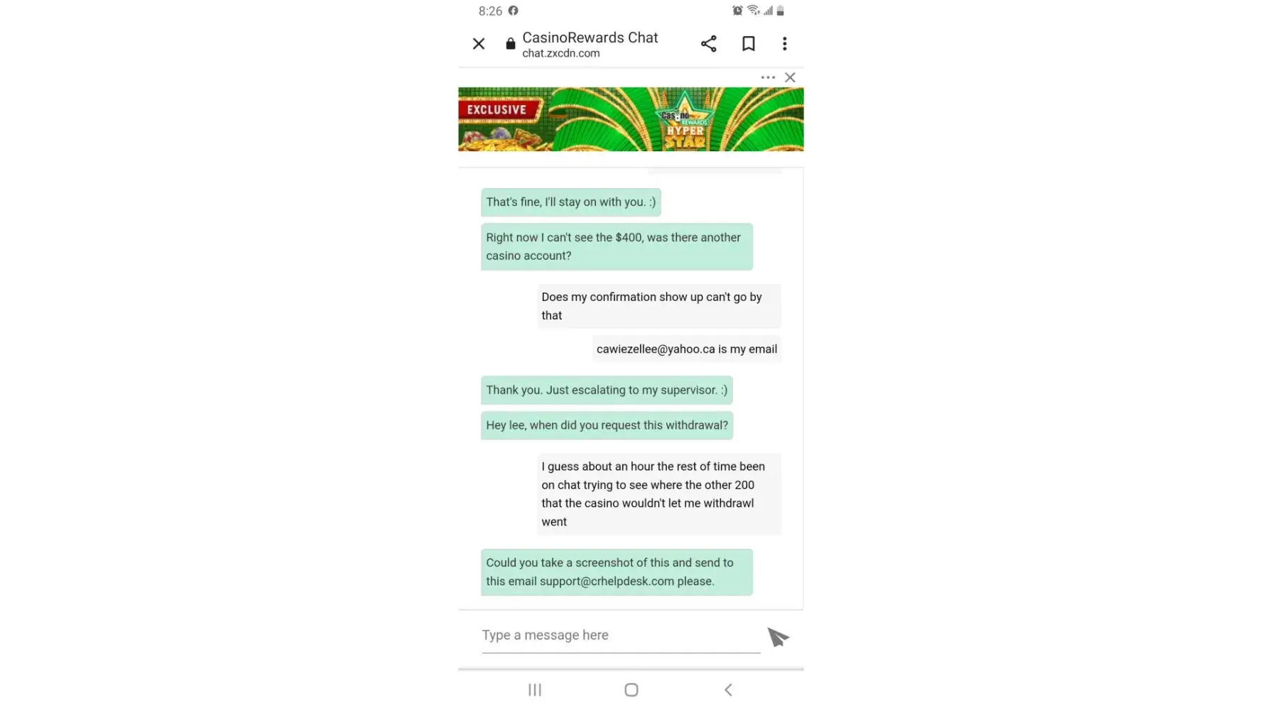 I totally agree with Kristhna 411 posting . I received a $22 chance to redeem it into bonus cash . Now ive been playing for 4 straight days hours and hours and hours of spending my time and money by this casino . Currently im sitting on $500 im trying to withdraw . I try there automated chat person who supposedly is going to help me ( ya right ) all they did was offer me more bonuses when i try to tell them my problem they always say thank you for contacting us and please rate me out of 5 stars on how i helped you today . ( IS THERE ANY POSSIBLE - 10 minus 10 ) . If any one has incurred these problems or has a solution to my problem helping me get what they owe me thank you . My e-mail is vinsondonald6@gmail.com