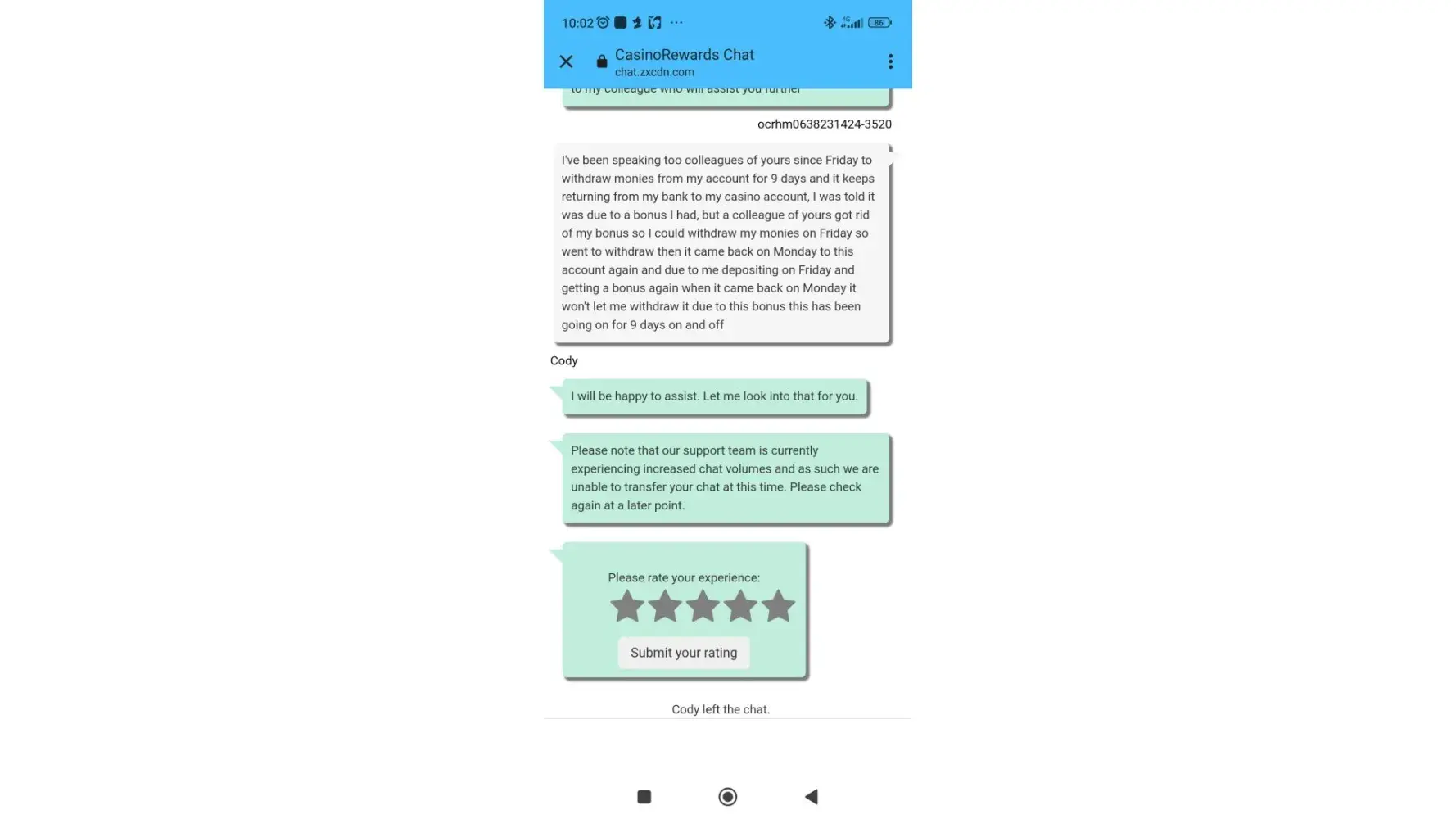 I also suspect some of their games are rigged. When I played there, I noticed that when I tried stopping the reels they would always quickly bypass anything good like scatters and give me a horrible spin. I'm unhappy with their service and treatment of me so far.