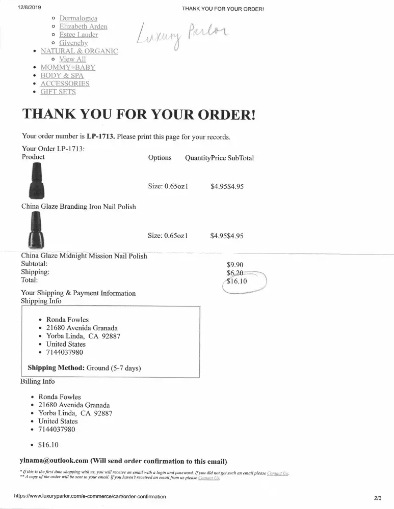I ordered 2 China Glaze nail polishes and sent credit card info on Dec. 8, 2019 and still have not received the products.