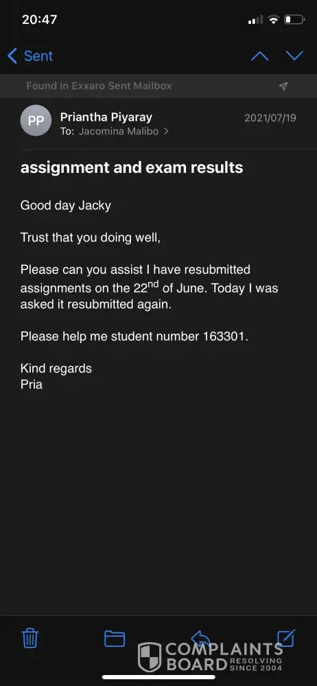 Getting any assistance, feedback or results is impossible. Student fees paid but cannot get answers on missing exam results, assignments or anything.