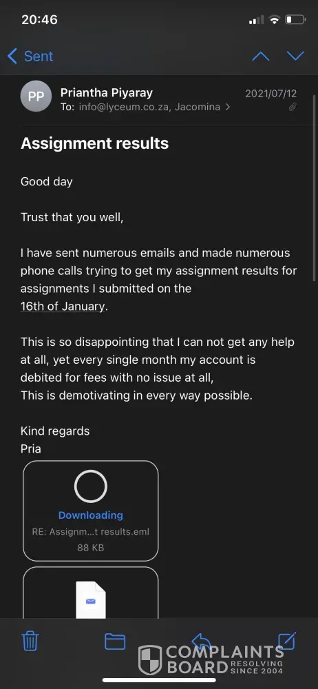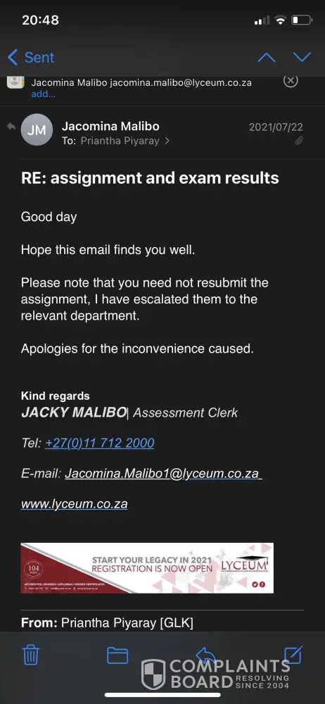 I started the process of applying and registering at the college back in early February this year with a student advisor by the name of Natalia Davids she eventually sent me the forms after about a month and a half after I enquiried about the Grade R course she sent all the forms I filled them and sent back I sent follow up emails followed by phone calls trying to get feedback on my application eventually by end of March after literally hounding them for feedback either she was never at work or she never replied to my emails but my application was finally approved and awaiting payment for the registration fee of R4000 8 paid on the 30th of April and sent proof on Monday the 3rd of May and waited for feedback I left it that week on Friday I sent an email requesting feedback for acknowledgement to advise me if she has received the proof of payment no reply I phoned the college she was not at work but I was advised to wait as the process was delayed due to the number of students applying I should give it a week that was last week Friday while waiting for the week to finish so I can follow up next week I received an email from another student advisor named William he sent me forms of the same process of application that I have done already I replied to his email telling him I've already done this and paid I'm waiting for feedback for the registration he an automatic response came stating he was busy he'll get to me initially I got worried that what is going on now as it was later in the afternoon I waited for the following day I phoned and asked for Natalia my student advisor as usual she was not in I raised my concerns and refused to go without an explanation I was promised that her supervisor will contact me I waited and no call was received I phoned again today the 13th of May 2021 asking for her again I was transferred and the call was ringing and no answer and it was dropped I phoned again really frustrated this time told the person helping me that I'm not taking this I'm tired of this run around she told me to hold she tried her and got back to me telling me she doesn't know where she was not sure if she was on break or not she took my details and promised as soon as she comes back she will call me and still nothing now I'm worried If I was scammed or not I paid so much money and 13 days later no one has any answers for me please help either refund me or get me registered so I can finally study after almost half the year trying to enroll and register. Seriously Lyceum is unprofessional and really frustrating