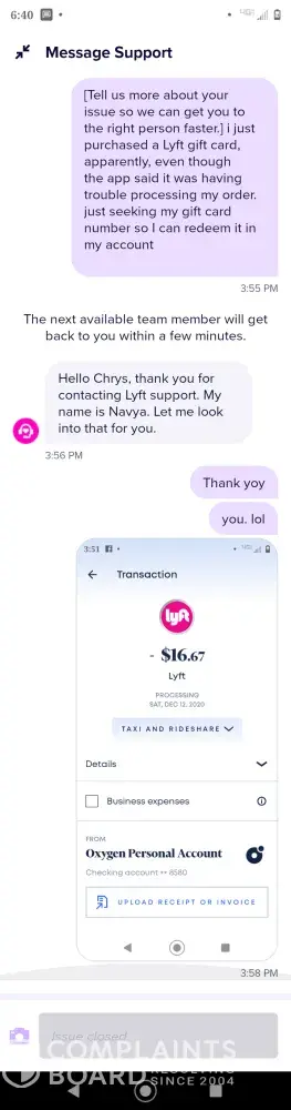 Ok so supposedly I owe lyft money even tho every ride had a hold placed on it as I chose daily billing. The 2nd issue, I purchased a lyft gift card, or attempted to, but upon submitting there was an "error processing" yet my account was still charged for the transaction. I reached out to support several times & 4/5 my support ticket was closed w/o anything being said or resolved