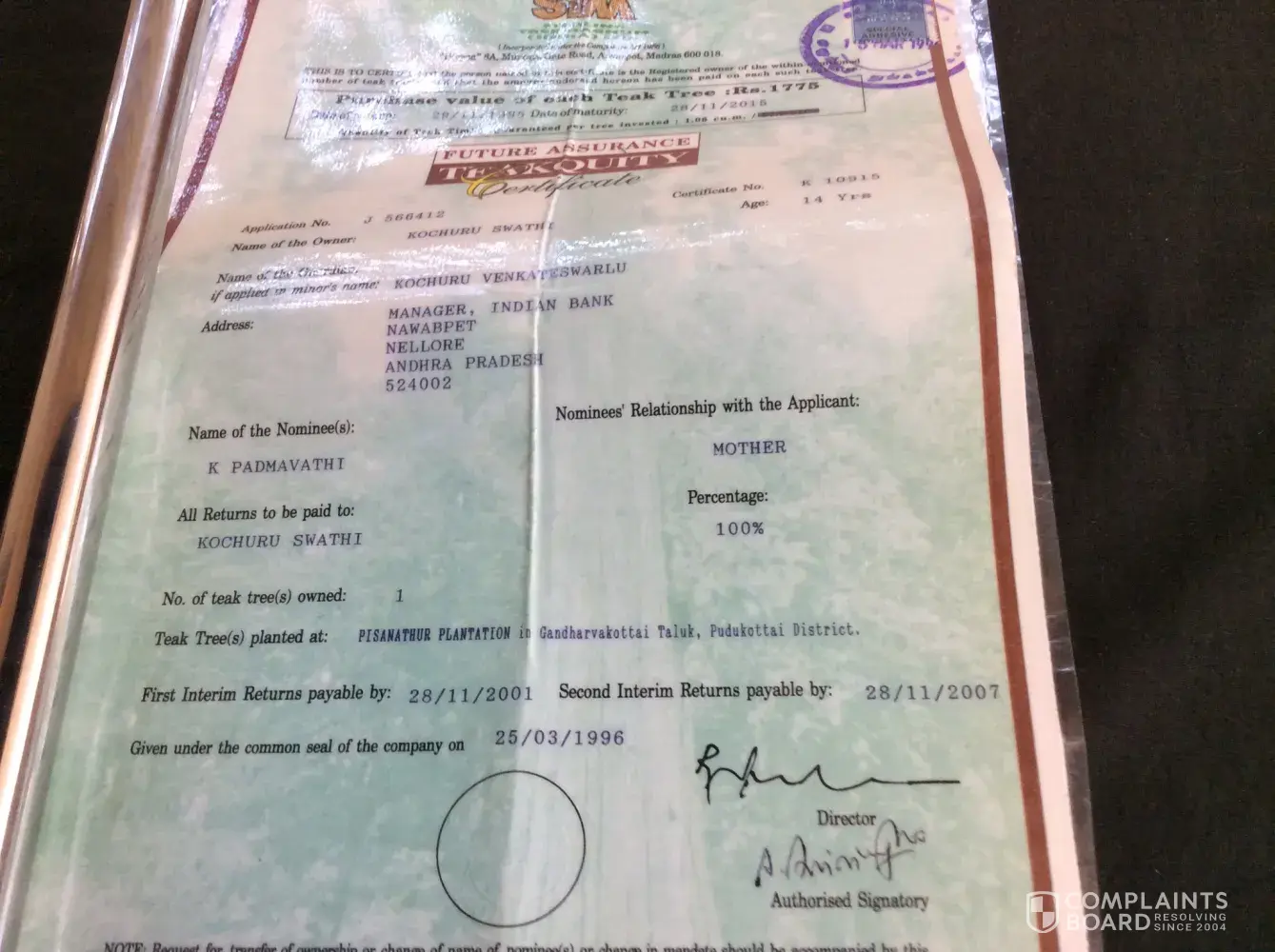 I had invested rs 7100 for 4trees @rs 1775 each on 21/06/96. certificate no k 28850, k 28849, k 28847, k 28848. so far I have not received returns due on2002 & 2008 &no information about co' s status.