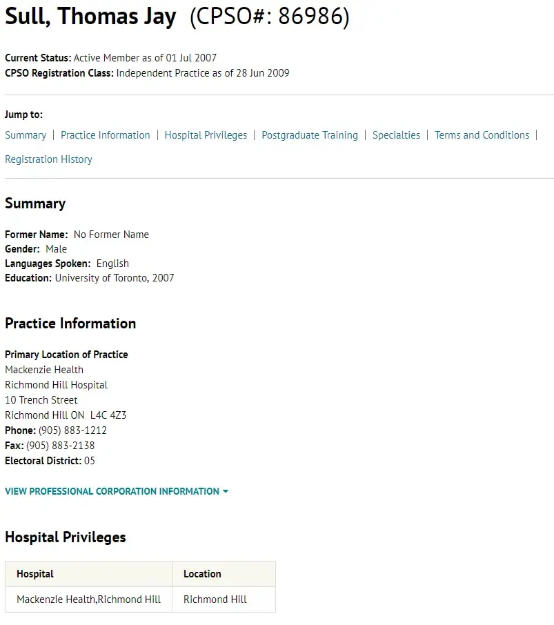Criminal Thomas Jay Sull (CPSO#86986) from Mackenzie Health Richmond Hill Ontario Canada — dead consequences / hospital services