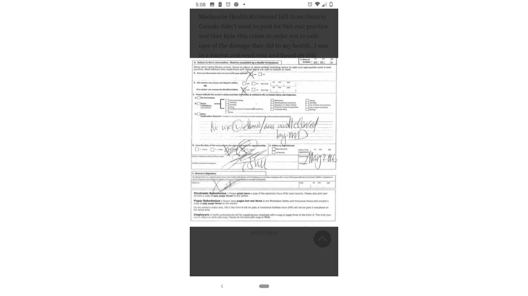 I travel to canada under a program named canada international experience (work and tourist visa) I suffer an accident in my left arm at my job and went to mackenzie health richmond hill ontario canada. they vaccine me with an illegal device and my health got very affected, they didnt want to provide a decent medical treatment. they commit corruption in order not to pay for mal practice.